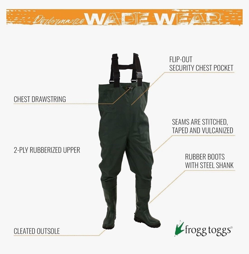 Up for sell is FROGG TOGGS Cascades 2-ply Poly/Rubber Boot Foot Chest Wader