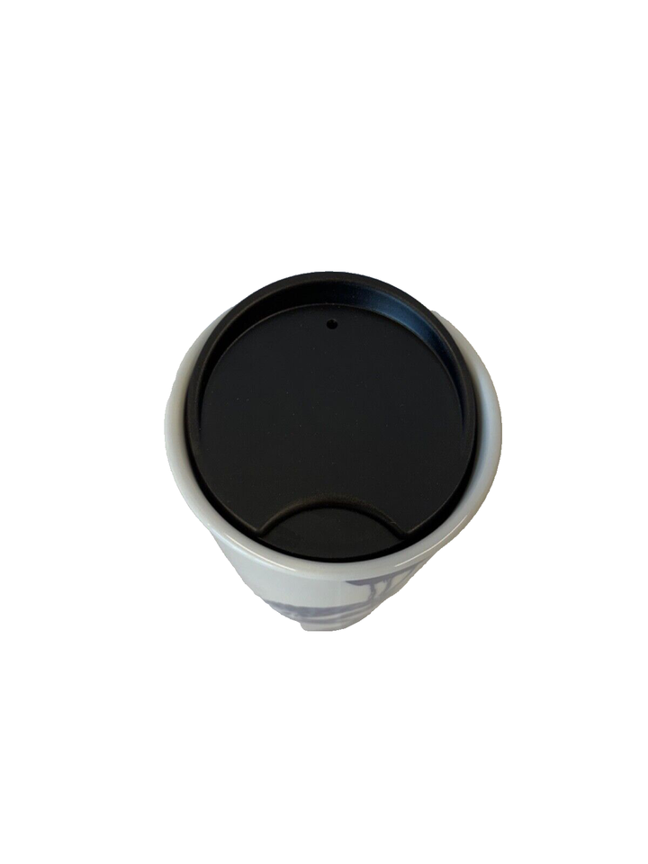 STARBUCKS 2016 12oz Ceramic Tumbler with Lid. White tumbler with blue peacock design. NEW