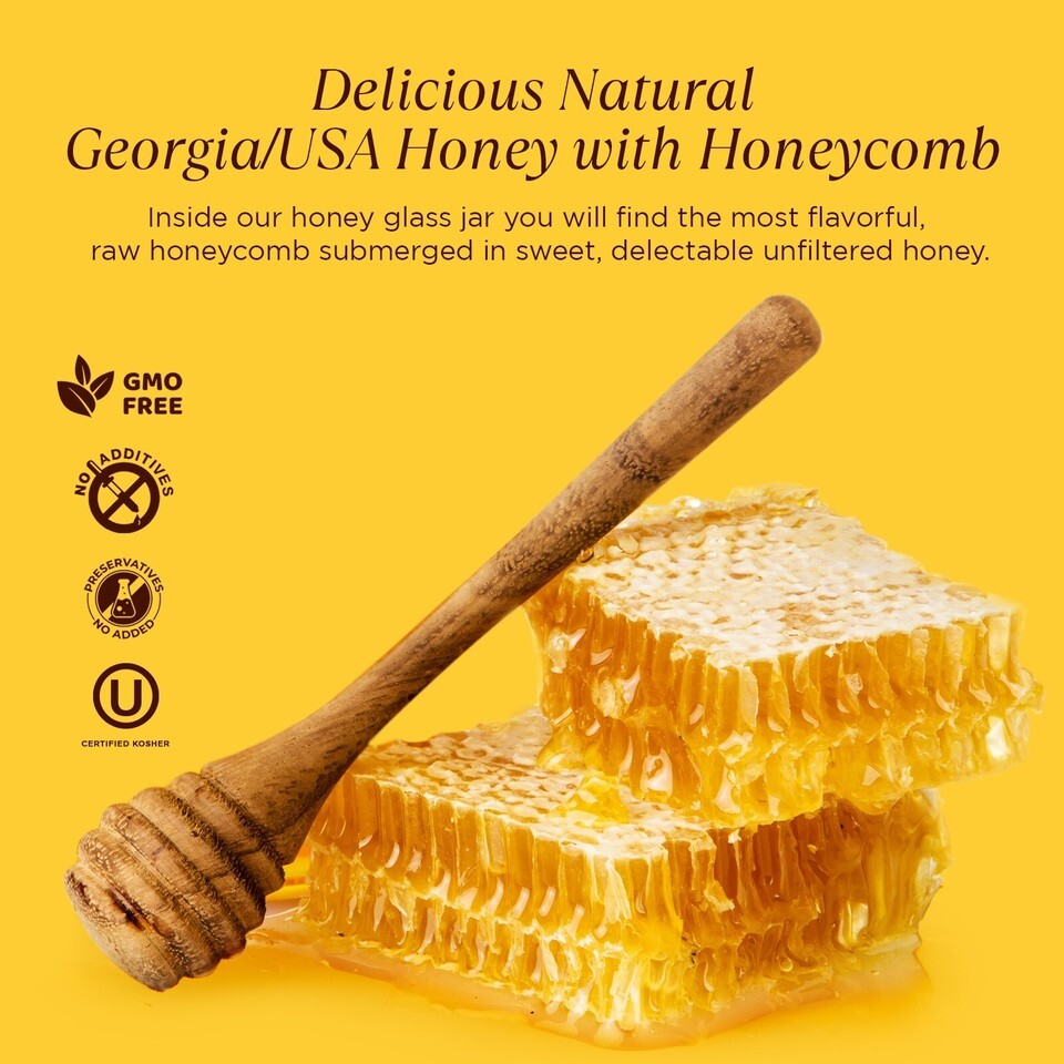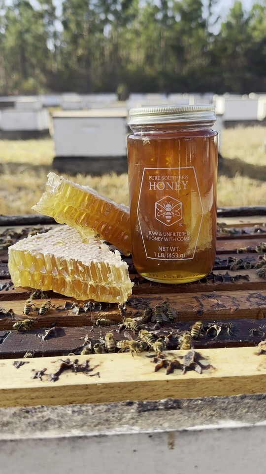 Raw honeycomb submerged in sweet, raw, and unfiltered honey. This gourmet honey derives from a range of floral sources native to Southeast Georgia, consisting of mainly Gallberry with some Tupelo, Blackgum, and Palmetto flowers. It is unique in its natural flavor and that it does not crystallize quickly, giving itself a longer shelf life compared to average honey?s.