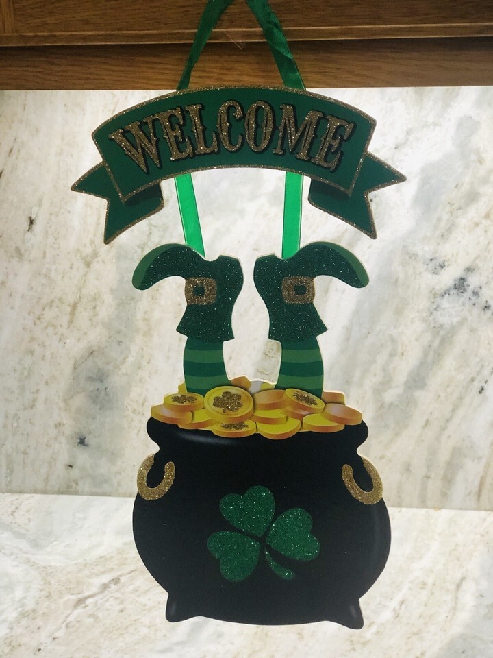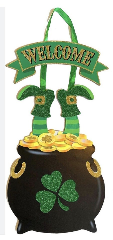 St Patrick's Day Green Shamrocks Hanging Irish Leprechaun Sign Wall Decor 15”.