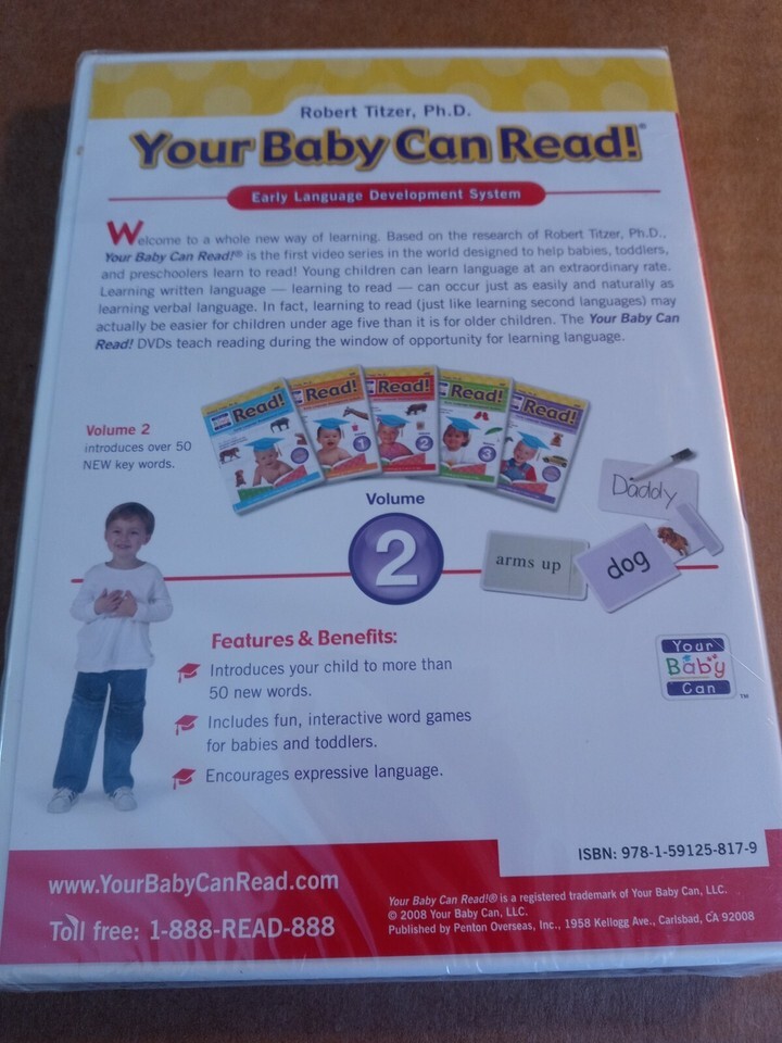 Your Baby Can Read! DVD Volume 2 Robert Titzer, Ph.D. Infants And Children NEW.New Condition ; See Pictures Attached For Exact Condition . Shipped with USPS First Class Mail . You Will Receive 1 ea DVD as shown in pictures attached. SHIPS N 24 HOURS Packed By Our Award Winning Packaging And Shipping Department Long Time E-commerce Seller For Over 20 Years LIMITED AVAILABILITY THANK YOU FOR SUPPORTING OUR FAMILY OWNED USA BUSINESS Collectible New DVD- DVD's Are Tested And Cleaned With Our Professional DVD Cleaning Equipment Before Shipped - Ships Immediately - Great Product at a Unbelievable Price - Your Chance To Own This Collectible DVD Before Its Gone Inventory Box #6405