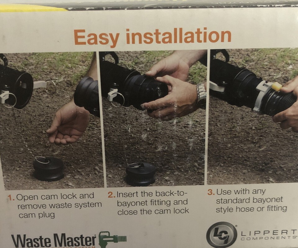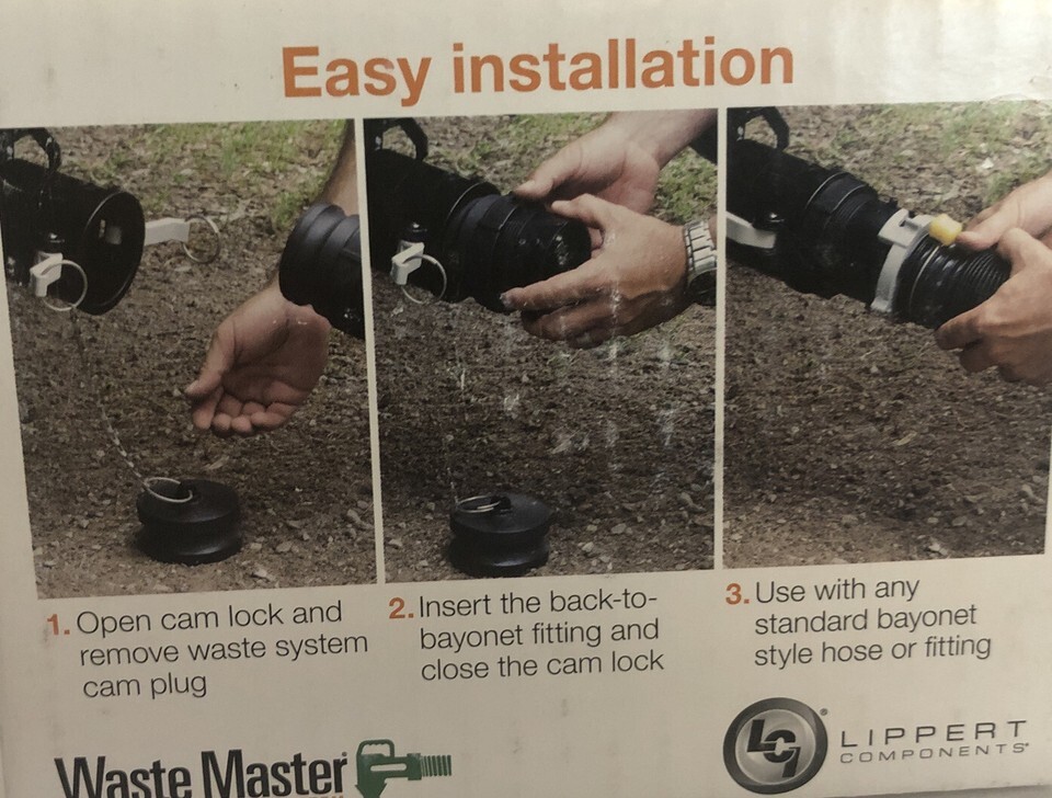 The time-tested Waste Master CAM lock connector ensures a leak-proof connection to the sewer outlet. Traditional RV hose bayonet fittings can leak, but industrial grade CAM Locks have been used in the liquid transportation industry for decades and are proven to provide a strong, reliable seal.