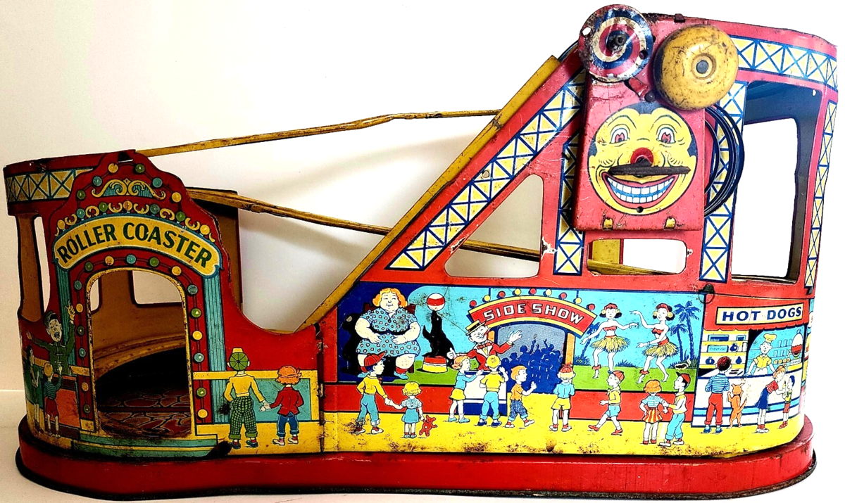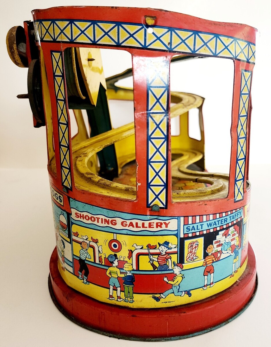1940-50s J. Chein Tin Litho Wind Up Rollercoaster Toy Antique Circus INVRM