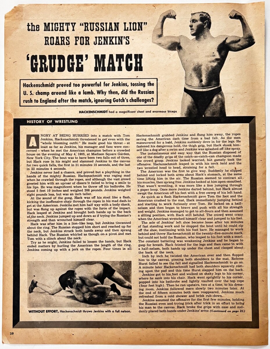 1952 Pro Wrestling Hackenschmidt Jenkins Grudge Match Article MSG Gotch DWXX5