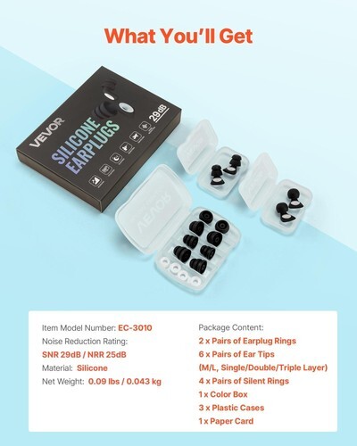 Our earplugs provide NRR25dB/SNR29dB noise reduction. They come with 4 earplug rings and 12 ear tips for an ideal fit. Made of soft, washable silicone, they are reusable and hygienic. The portable case makes them easy to carry and suitable for sleep, work, and travel.