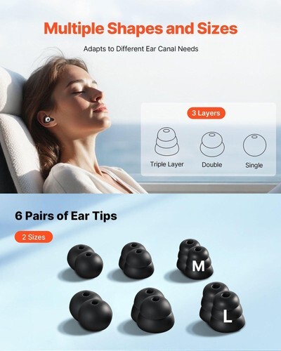 Ideal Fit for Your Ears: This sleeping earplug set includes 6 pairs of ear tips, 2 sizes (M/L), and 3 layers (single, double, triple), ensuring an ideal fit for different ear canals. Keep one pair at home and take another on the go.
