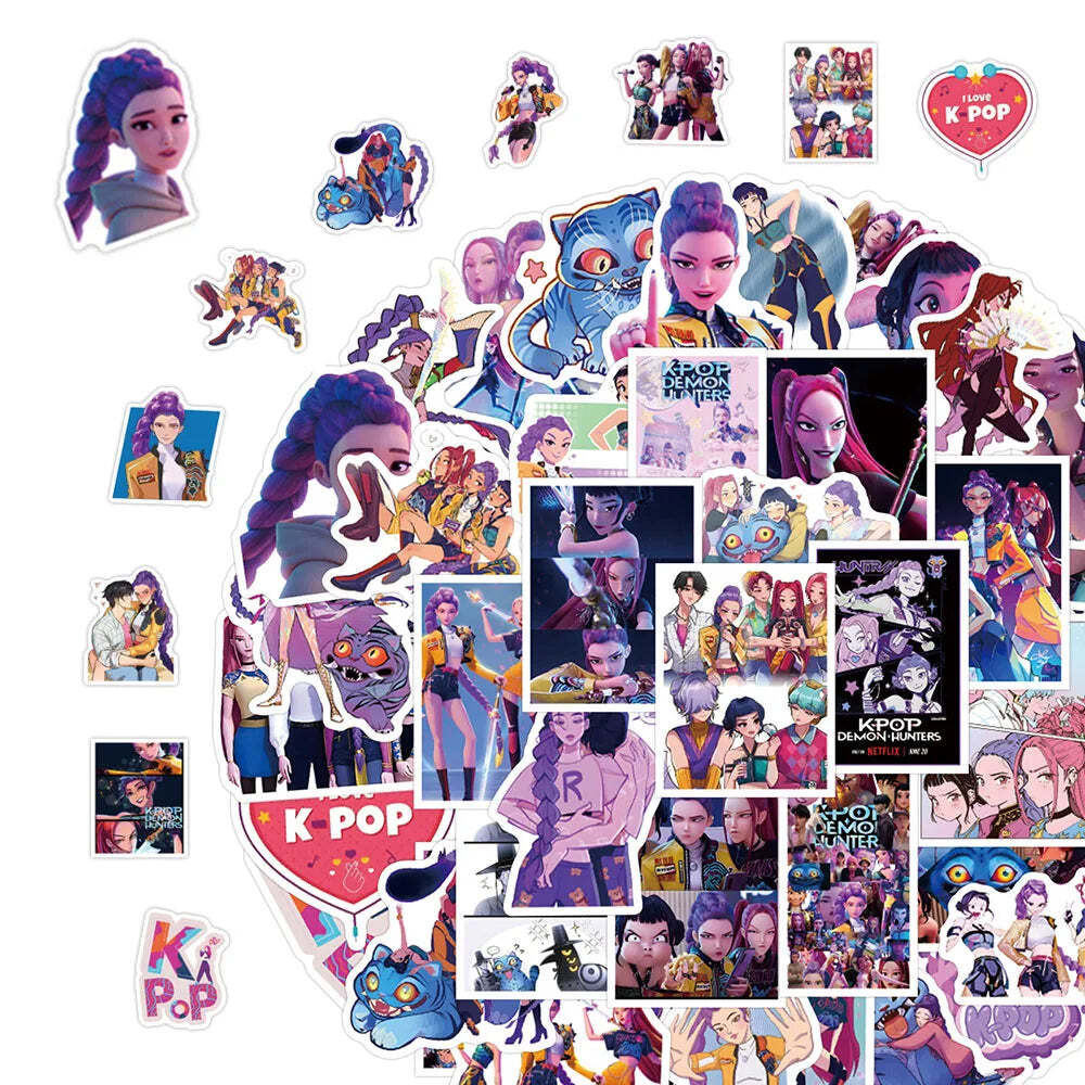 Turn your everyday gear into a bold anime statement. These Animated Movies KPop Demon Hunters Stickers bring your favorite demon-slaying heroes and villains to life on your phone, laptop, luggage, skateboard and more. Whether you’re a dedicated anime fan, a K-pop lover, or shopping for a kid who can’t get enough of cool characters, this sticker set is pure fun and creativity in one pack.