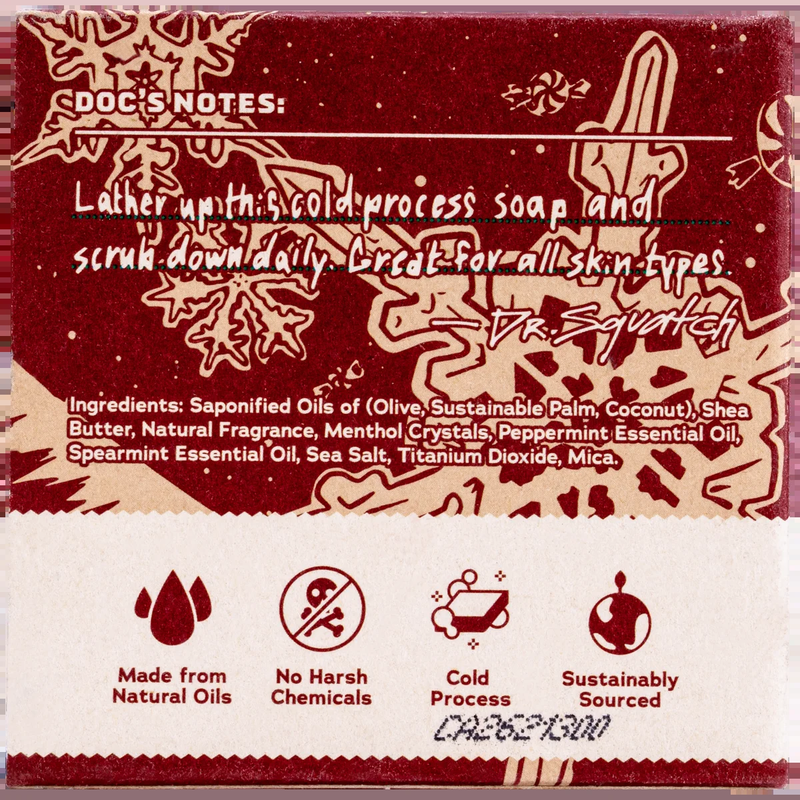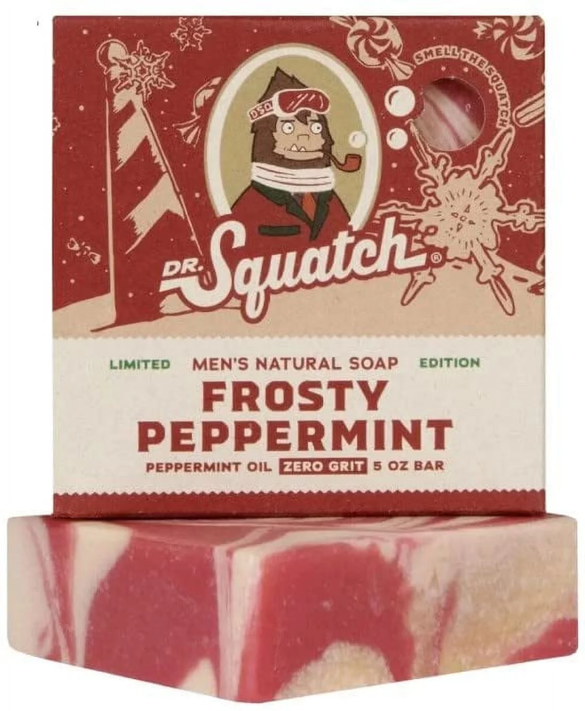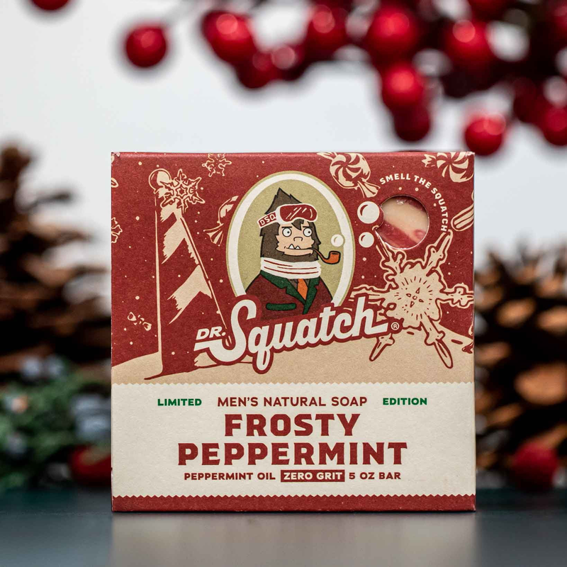 5 oz Dr. Squatch Frosty Peppermint natural bar soap Cold process bar made with natural oils Features a cool, minty scent with refreshing notes of peppermint Limited edition holiday release Handcrafted bar designed to cleanse and refresh