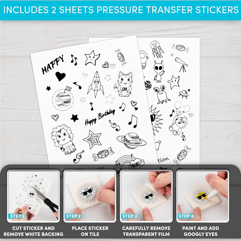 ?More Decorations Than the Competition! - 109 Crafting Accessories?Our DIY craft kit for kids (8+yrs) includes everything children need to make beautiful magnetic tiles, exactly as pictured: 8 Ceramic Tiles, 8 Adhesive Magnets, 6 Acrylic Markers, 8 Stencils, 77 Water Transfer Stickers and 10 Googly Eye Stickers. Each tile is 2?*2", making them the perfect size for little fingers to decorate! Our kits are great for boys and girls alike and are 100% child safe.