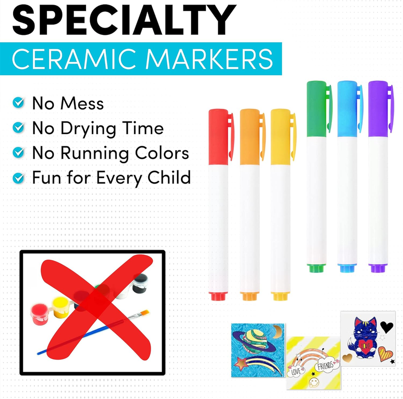 ?Mess-Free Premium Acrylic Markers?Instead of the difficult to use paint and brush set included by our competitors, our kit goes above and beyond with custom acrylic markers perfectly suited for the ceramic tiles. No more mess, drying times, running colors or otherworldly artistic ability required! Absolutely any child can enjoy decorating these tiles, letting their creativity soar and spending quality time together.