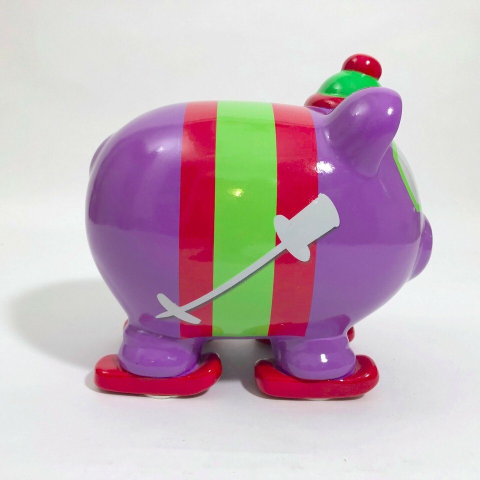 EUC Cute colorful ceramic piggy bank with purple, red, and green stripes with a cute beanie hat and racing goggles. A cute and colorful way to save your loose change. On the bottom of the feet there is some paint missing where the original pads were taken off and replaced with the round ones. See the pictures