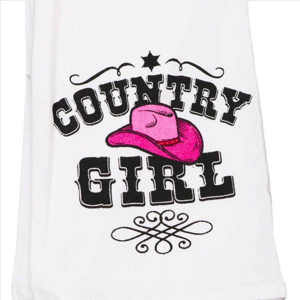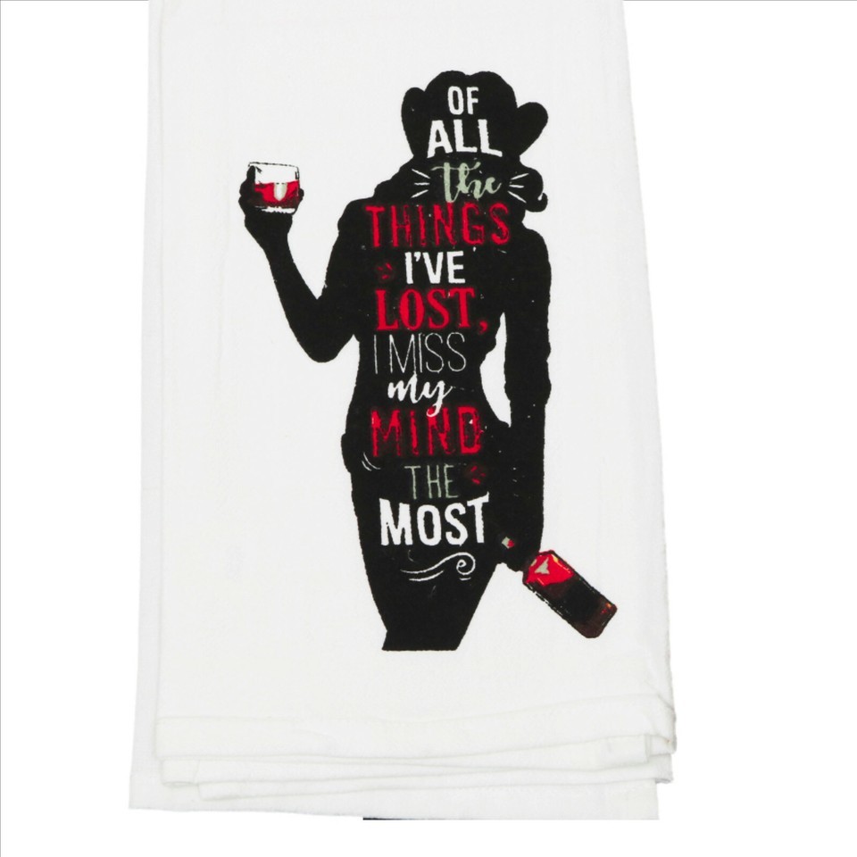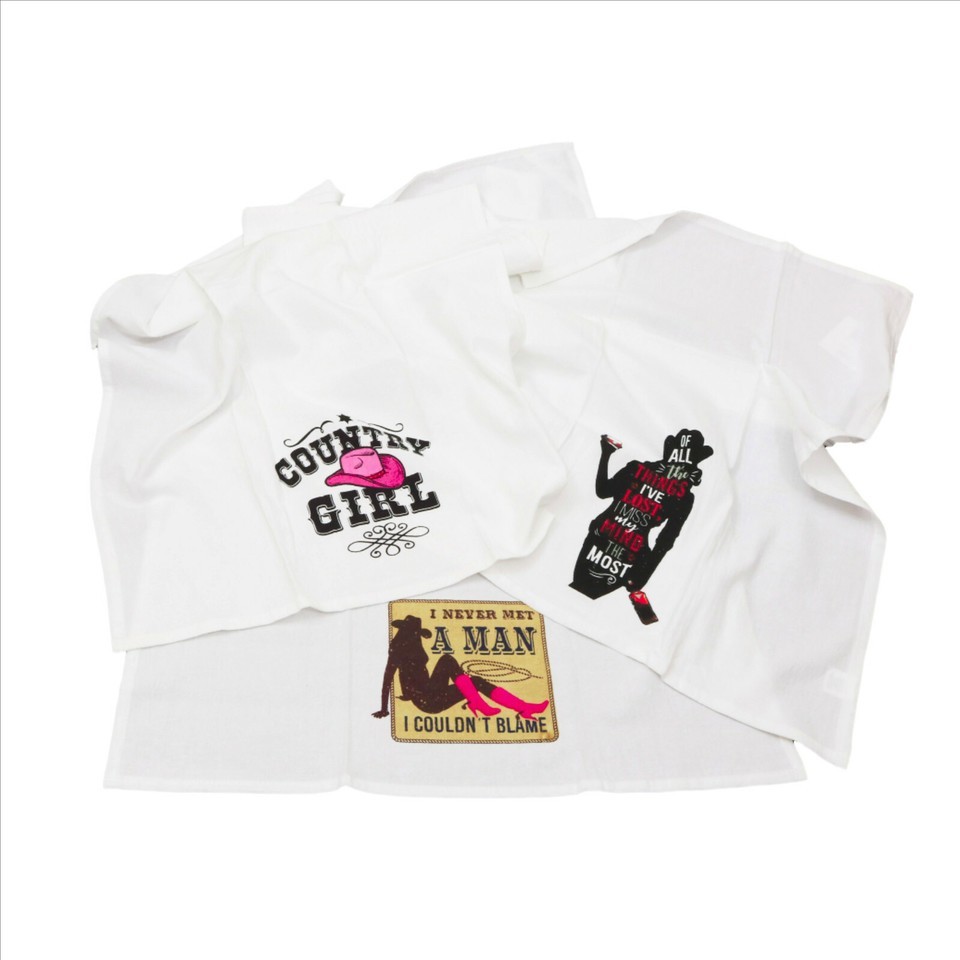 Stake your claim as an independent and strong woman with these cute 100% cotton print towels for your kitchen. A cute pink cowgirl hat accents one towel that proudly proclaims Country Girl. The second towel has a chocolate brown silhouette of a cowgirl with pink boots and a lariat with the words, I never met a man I couldn't blame, set against a tan background bordered with a rope design. The third towel in the set shows a black silhouette of a cowgirl holding a glass in one hand and a bottle in the other. The quote in red, white and gray is of all the things I've lost, I miss my mind the most.