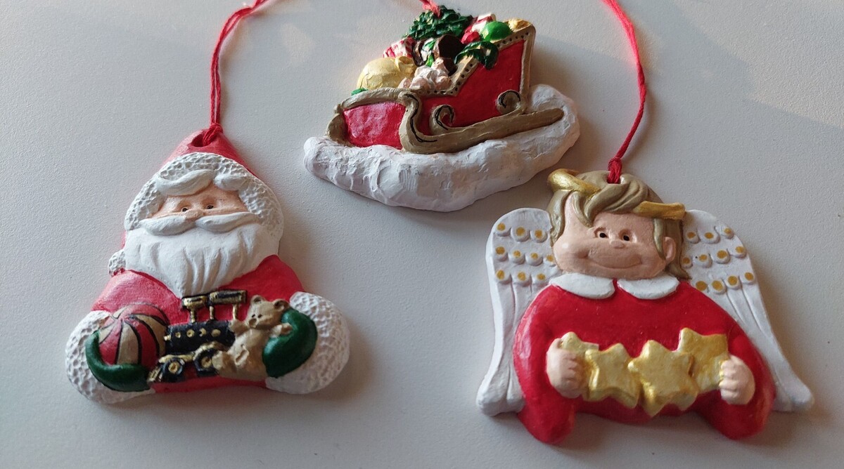 You are considering a set of 3 hand-painted ceramic ornaments. Each ornament measures about 3? in height and is shellacked to protect the paint. The backs are plain, and each has a hanging cord for display. You will receive Santa, and Angel, and Santa?s sled. New from a smoke-free home.