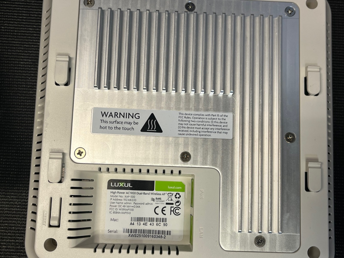 Lot of 2 Luxul XAP-1510 high power AC1900 dual-band wireless access points, used and pulled from a working environment. Units only (no PoE injectors, power cords, or Ethernet cables included); dual?band 802.11ac with 33 MIMO, beamforming, and up to 1900 Mbps combined throughput, ideal for residential or commercial Wi?Fi upgrades.