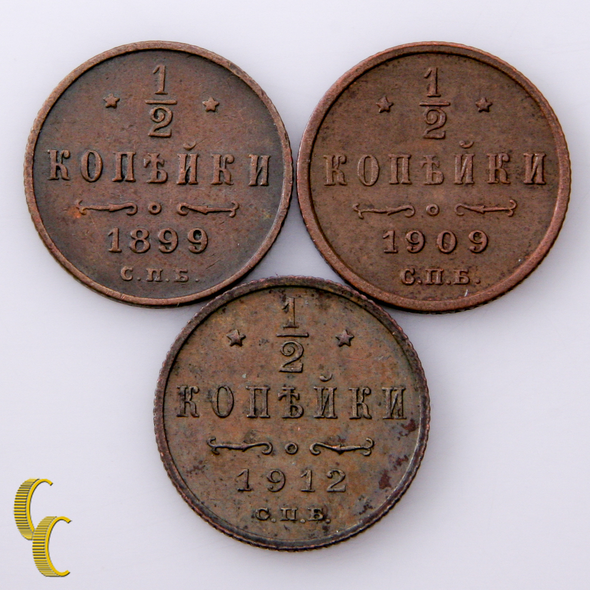 1899, 1909 1912 Russland 1/2 Kopeken Menge Von 3 Münzen Alle (VF) Sehr Fein