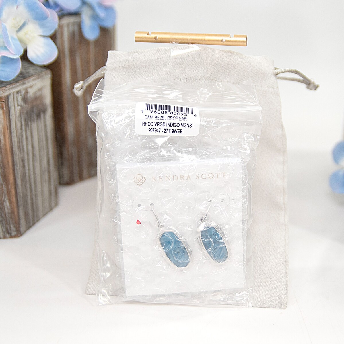 Kendra Scott Dani Rhodium Silver Bezel Frame Indigo Magnesite Earrings NWT