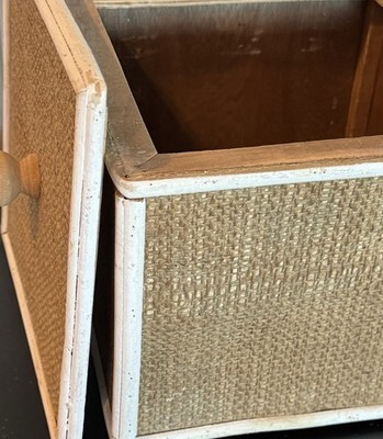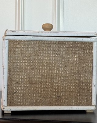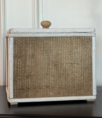 Textured, burlap-like sides and lid framed with white wood