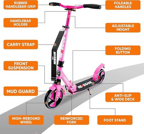* PINK FOLDING KICK SCOOTER FOR TEENS AND ADULTS ? Cruise along in style on our compact kick scooter! Featuring smooth gliding wheels for maximum shock absorption and a lightweight alloy deck, our teens and adults kick scooter is a comfortable ride
