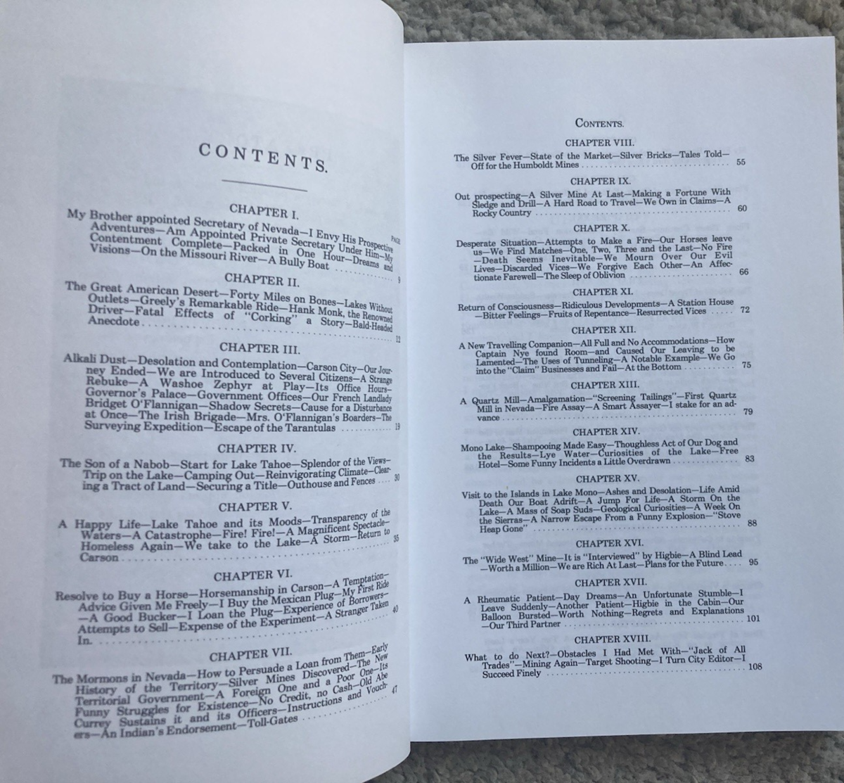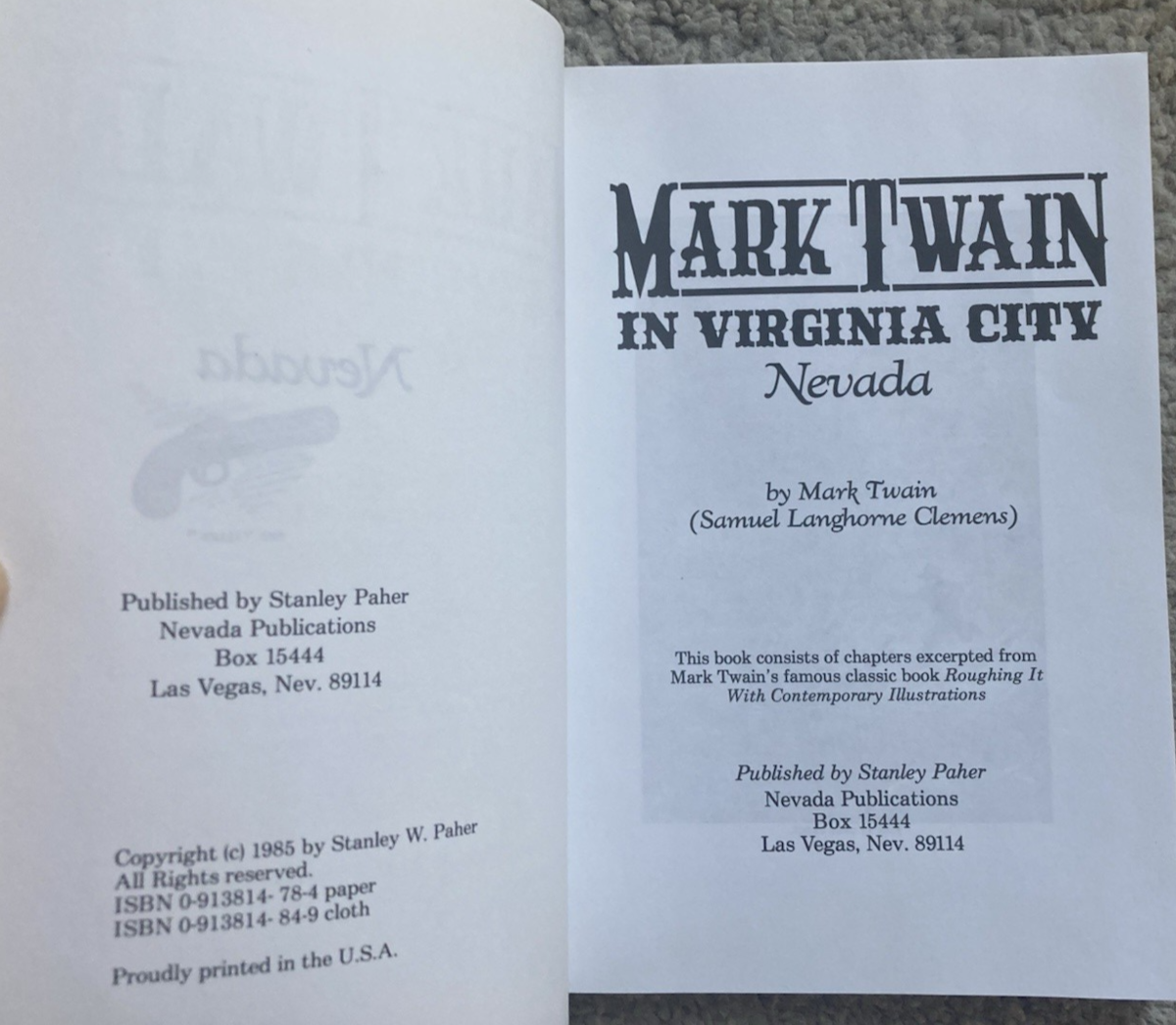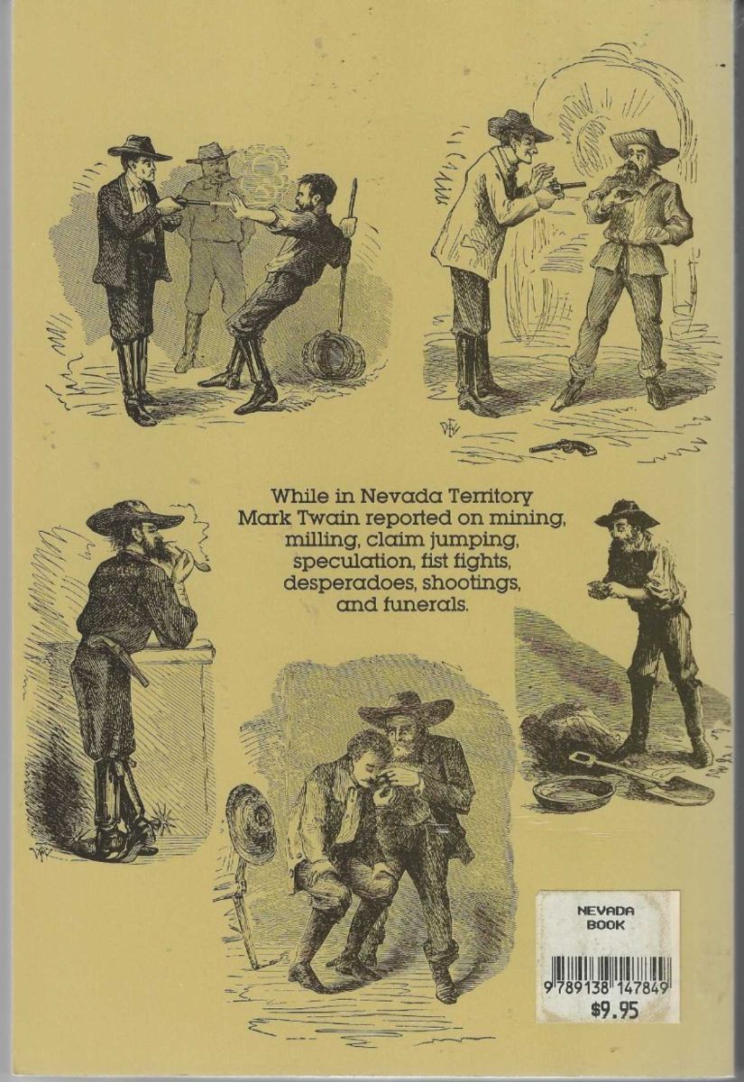 6" x 9", 192 page trade paperback titled MARK TWAIN IN VIRGINIA CITY NEVADA by Mark Twain (Samuel Langhorne Clemens)/ Nevada Publications, ISBN # 0-913814-78-4, First Edition (unstated), Copyright 1985/ While in the Nevada Territory, Mark Twain reported on mining, milling, claim jumping, speculation, fist fights, desperadoes, shootings, and funerals. This book consists of chapters excerpted from Mark Twain's famous classic book Roughing It With Contemporary Illustrations.