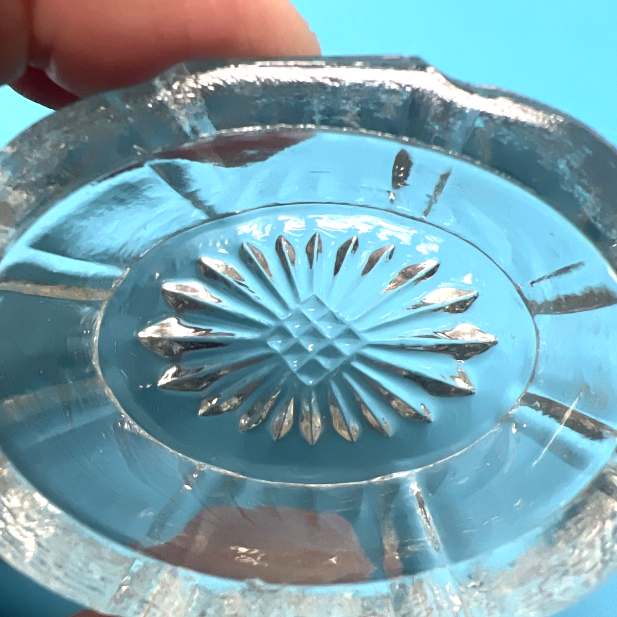 Beautiful Clear Glass Open Salt Dip Oval w Flower Bottom 2 1/4 x 1 3/4 x 1 inch In Great shape but it might have a fleabite, or it has a tiny mold mark