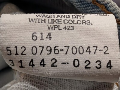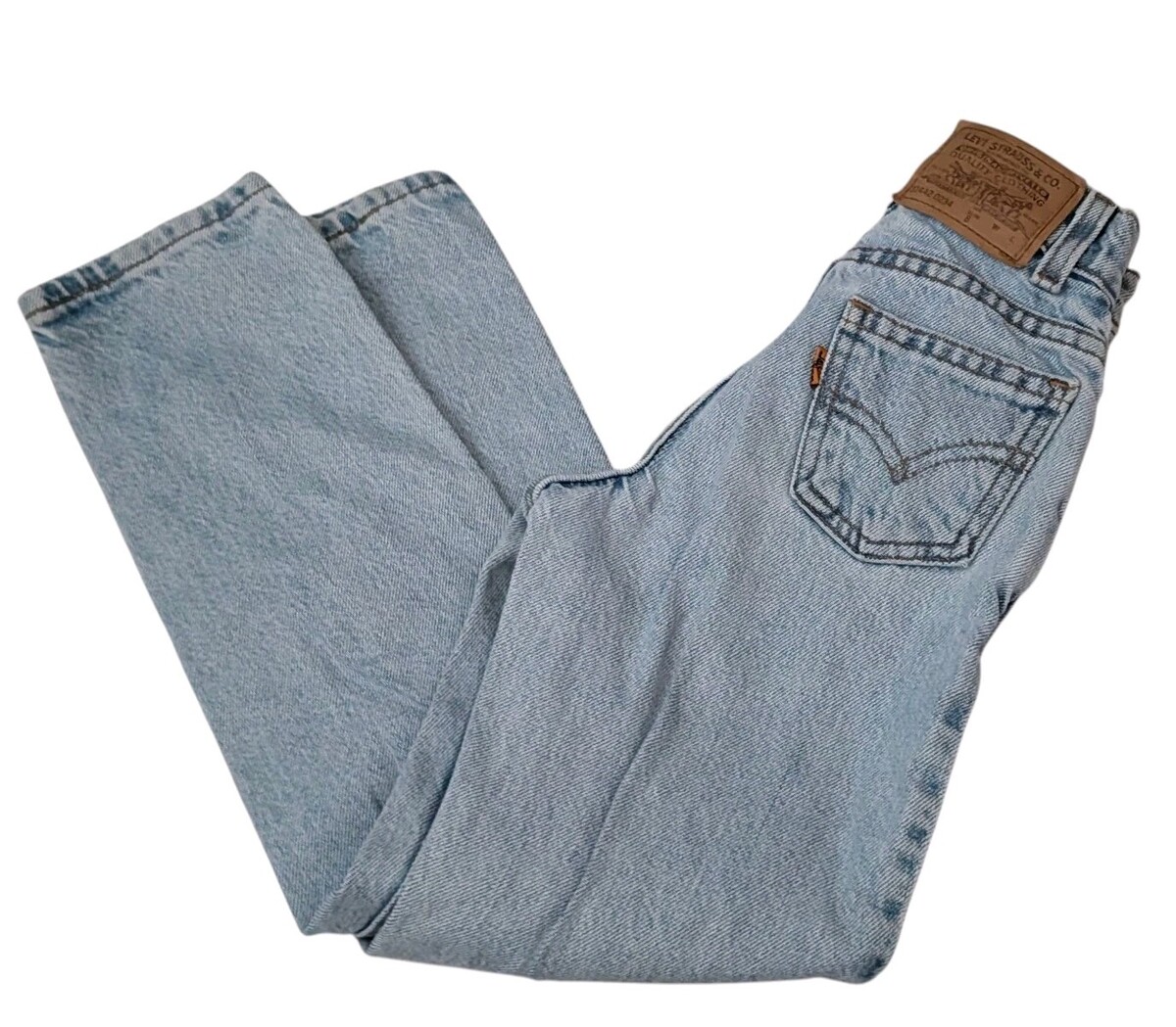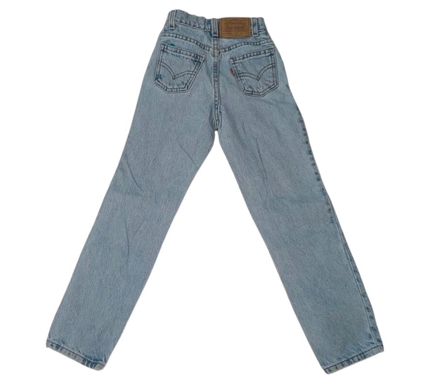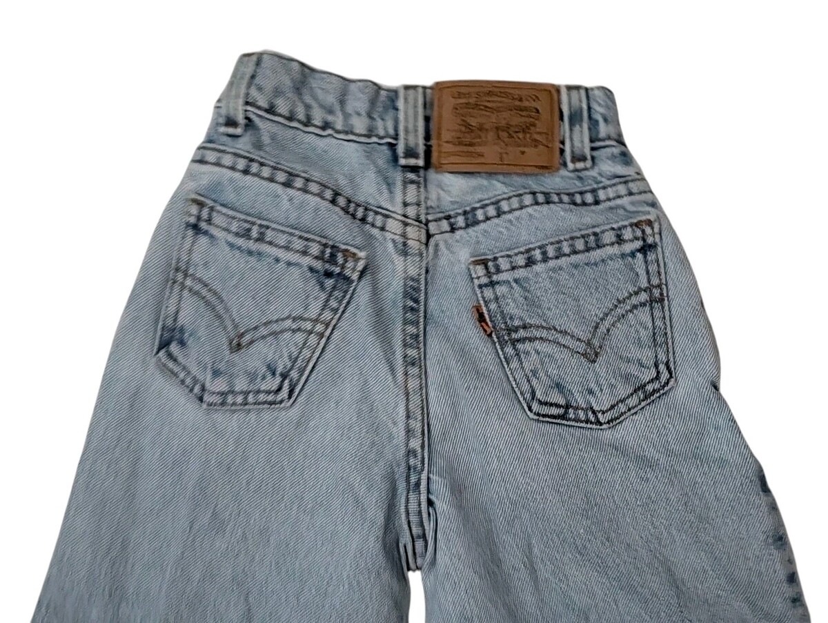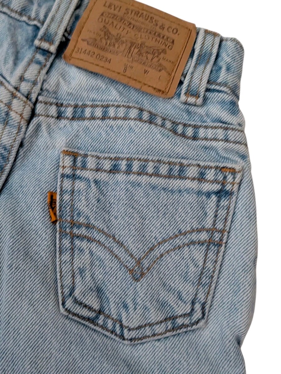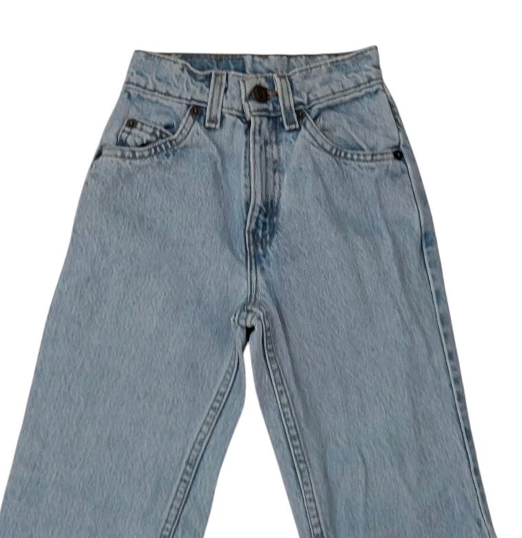 This is a pair of vintage girls Levi jeans size 8 slim. I believe they're from the 1990s. Orange tag. Stone wash. These jeans have a relaxed fit with a very slim waist. They have a high high 9-in rise. The waist flat across unstretched measures about 9.5 in. The dip goes down about an inch and a half in the front at the waistband. Fuller through the hips and thigh. These jeans are in great condition!