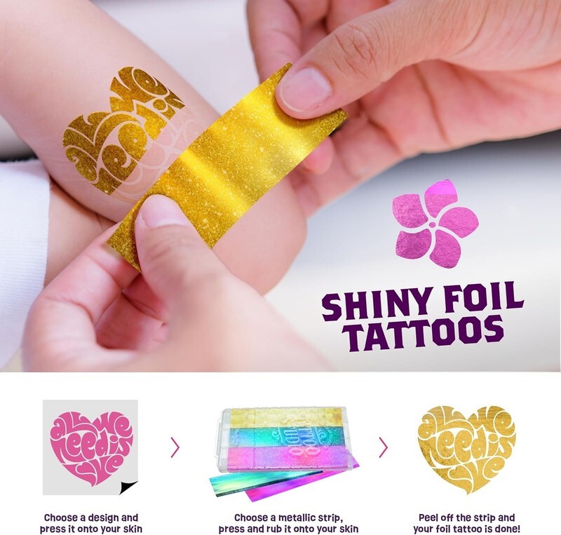 Metallic Magic: Experience the charm of foil tattoos! Just pick a design sticker, stick it, lay down your desired metallic strip color, and unveil a shiny tattoo that's bound to catch eyes.