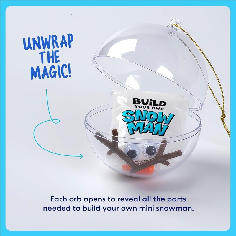 BUILD YOUR OWN SNOWY BUDDY: Dive into a winter wonderland of creativity! This 3-pack Build Your Own Snowman kit brings triple the fun ? each hanging orb opens to reveal everything you need to craft your own adorable mini snowman. Hang them on the tree, display them as decor, or gift them for a sprinkle of holiday magic everyone will love!