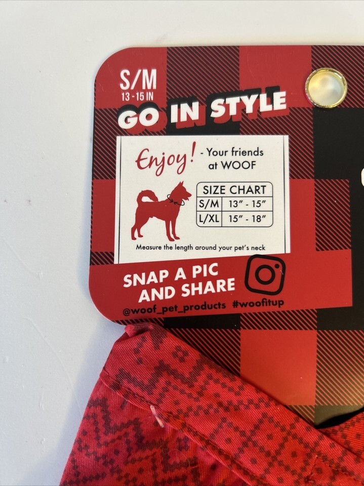 This is a Woof Pet Products Holiday Pet Dog Bandana in size Small, featuring a festive Christmas theme with the words "Official Cookie Tester" on a red background. Made from 100% cotton, it is suitable for small to medium-sized dogs and is brand new. Perfect for adding a touch of holiday cheer to your pet's wardrobe.