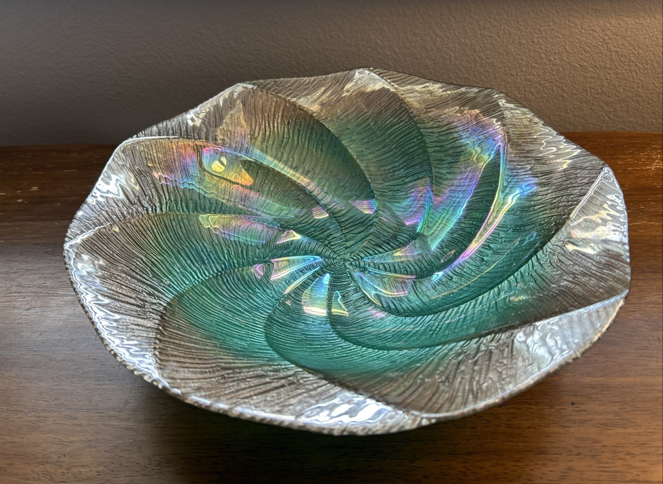 This 13" mint green, aqua blue, and gold 3D spiral centerpiece glass bowl by DC Glassware is a stunning decorative piece for your home or garden. Handmade in Turkey, this iridescent bowl features captivating colors with a shiny finish and is perfect for displaying fruits, candies, or potpourri. With its unique spiral pattern and vibrant colors, this bowl adds a touch of elegance as a standout piece to any space. Please note that this pre-owned item requires hand washing to maintain its beauty.