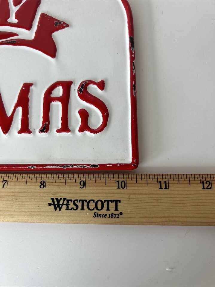 This is a RAZ Imports Merry Christmas Metal Sign measuring 10.5 inches in length. It is designed as an ornament for Christmas with a holiday theme. The sign is brand new and was manufactured in 2020.