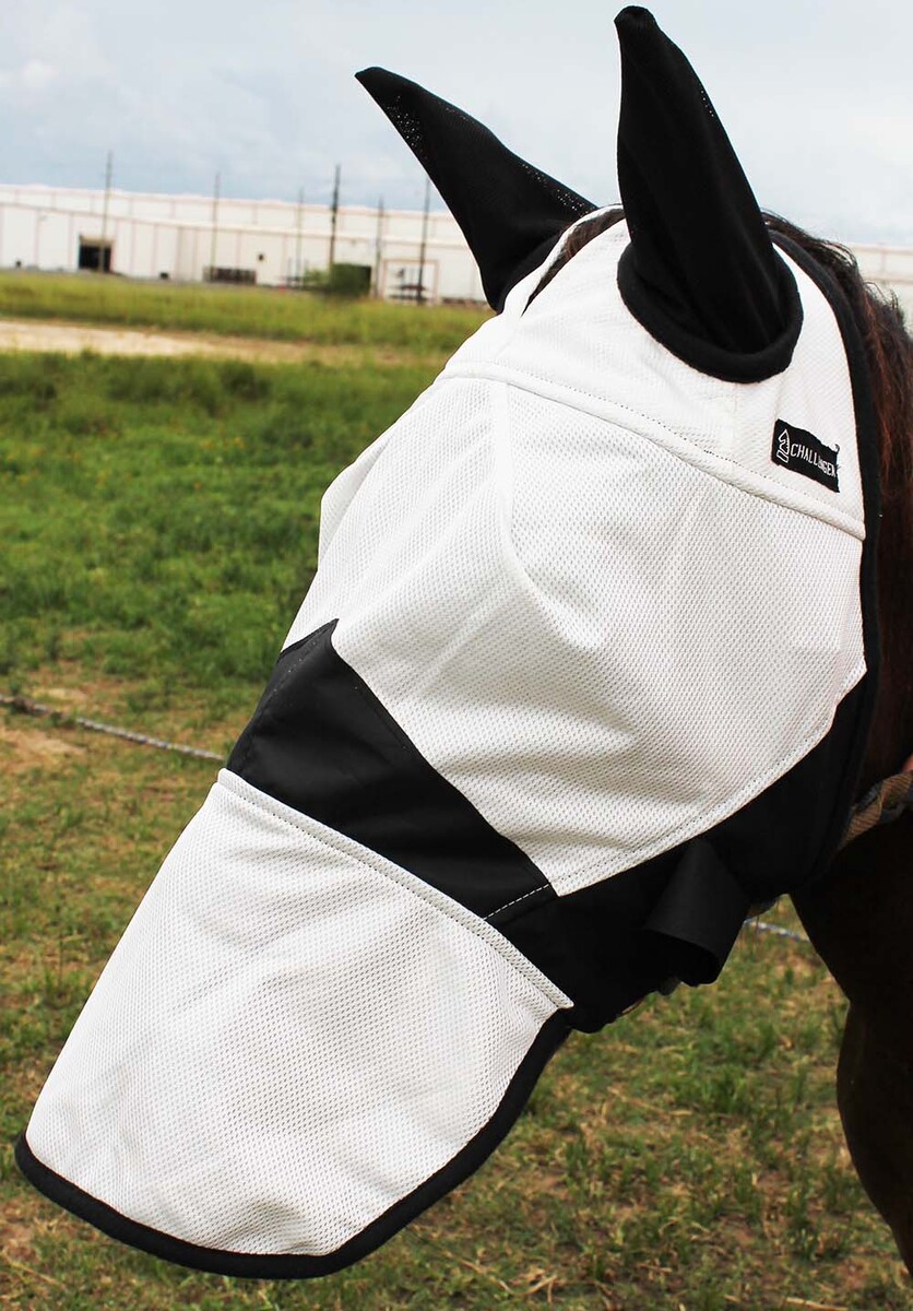 This Challenger Fly Mask provides great protection, from pest and UV rays from your horse's sensitive face, nose, and ears. Made from soft mesh material to allow for air circulation. Comes with heavy reinforced stitching for durability. Fleece edges for your horse's comfort. Top brand, top quality, at an affordable price.