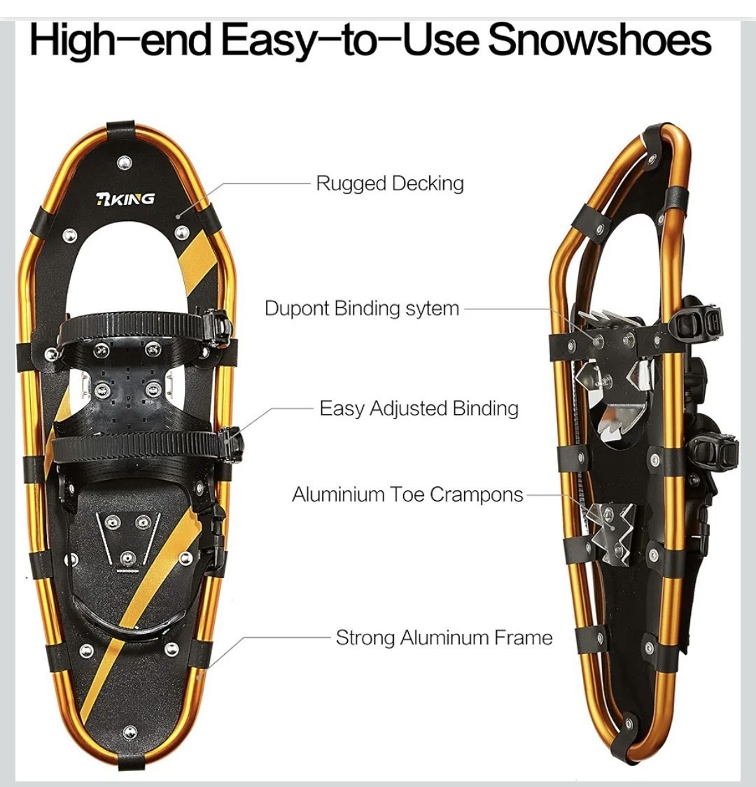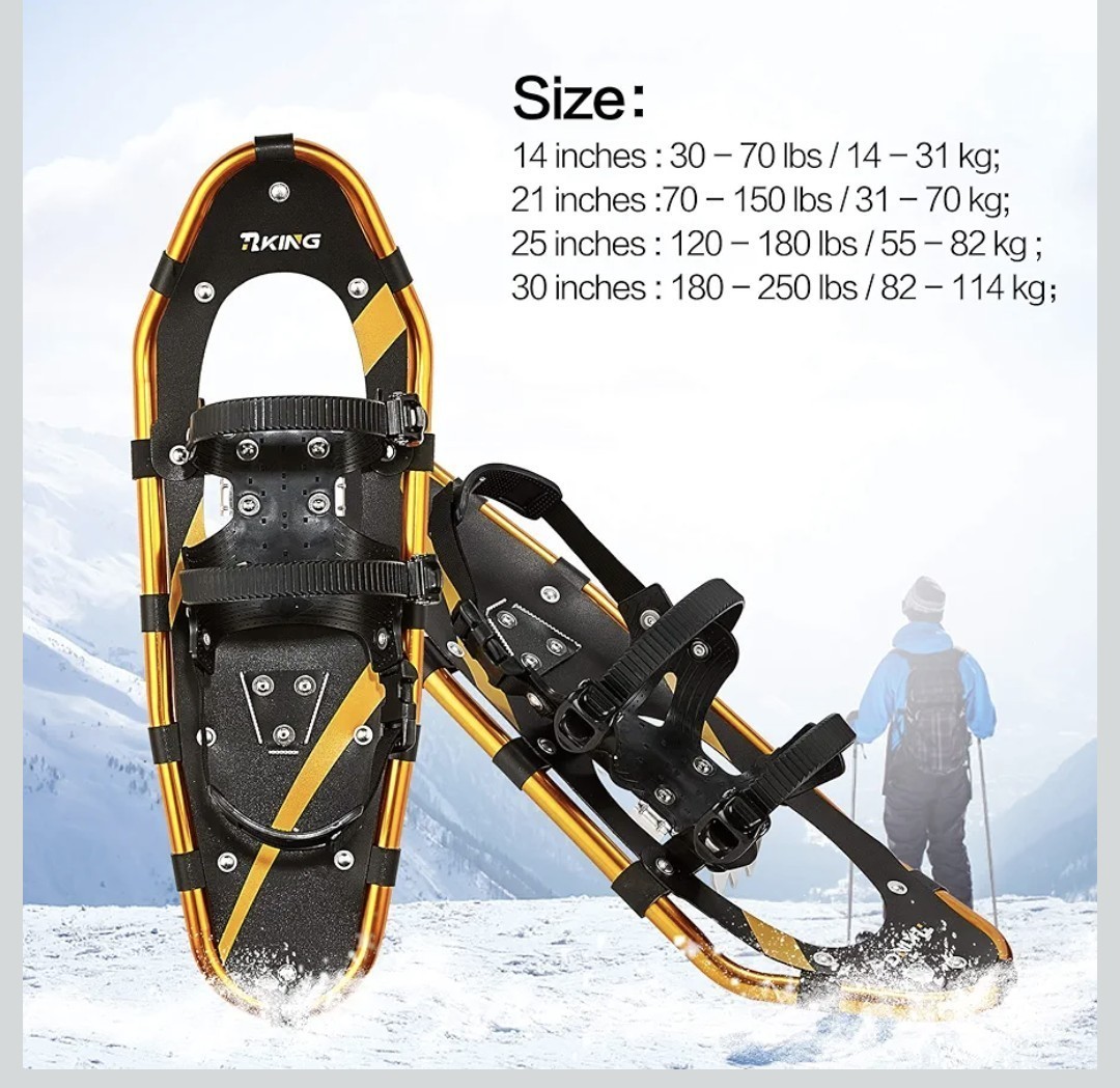 This is a brand new set of child size HRKING Adjustable snowshoes. These shoes fit children between 30 to 70 lb which is approximately 3 years to 10 years old. Comes in the carrying case with trekking poles poles. These are completely adjustable and adjust to the boot size.