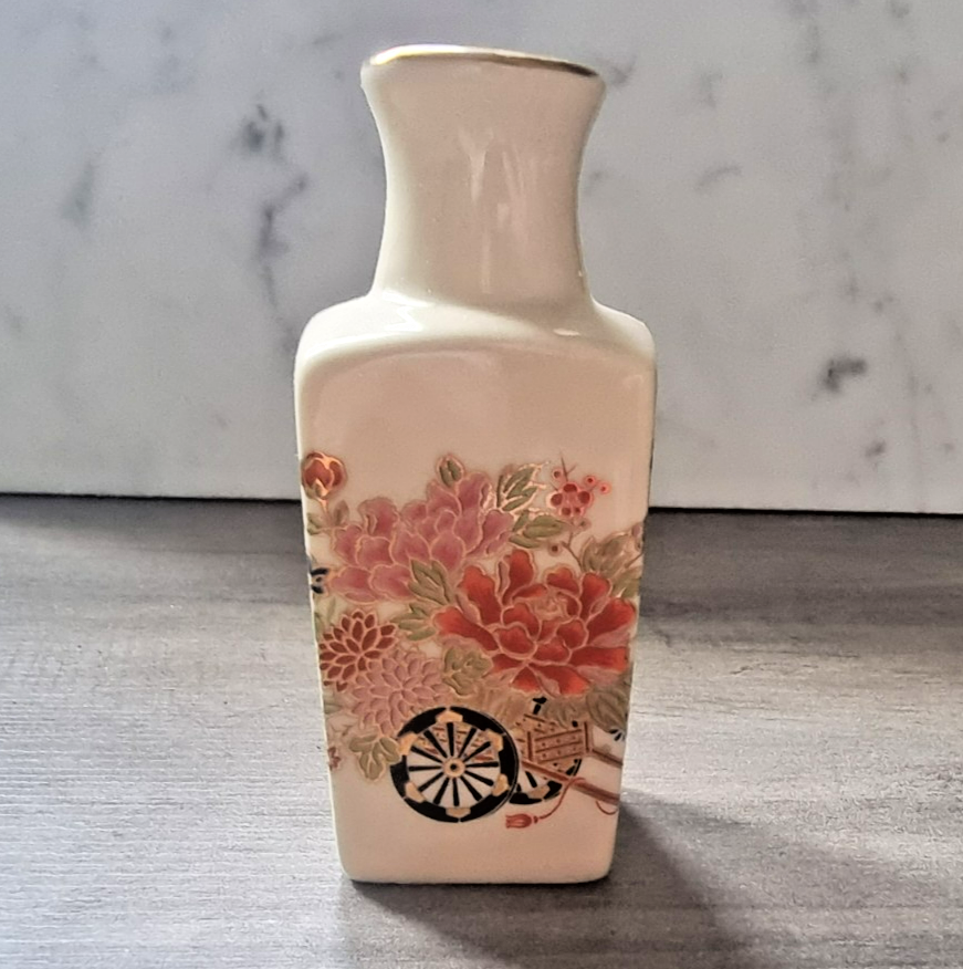 The product is a Japanese vintage 1950s Statuma style handpainted miniature porcelain vase. It features a floral pattern in multicolor, typical of mid-20th-century Asian design. The small vase is handmade in Japan and showcases a beauty theme with its handpainted finish. Ideal for all occasions, this unique piece can be cleaned with a damp cloth and is a collectible item perfect for those who appreciate artistic and traditional aesthetics from the 1950s era.