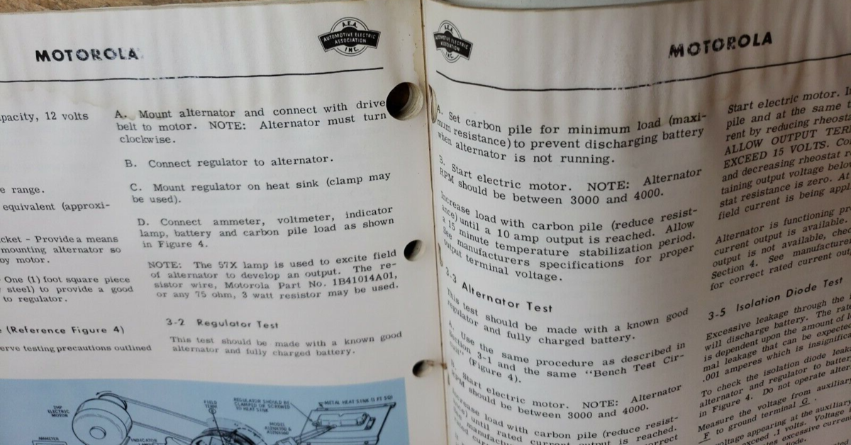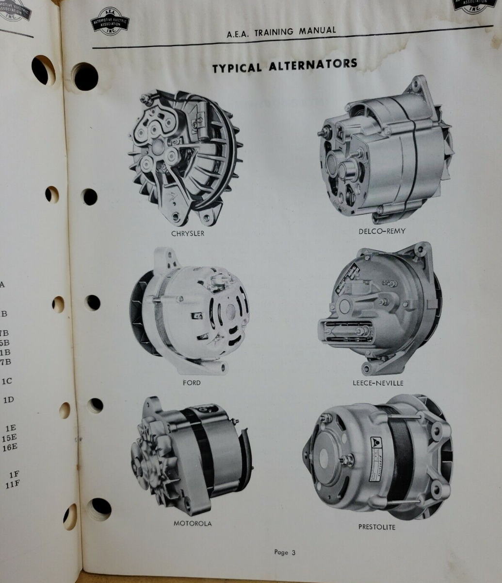 UP FOR SALE: This offer is for a 1967 AEA Training Manual for Standard Duty Alternators, for passenger cars and light trucks. It was published by The Automotive Electric Association, Detroit, Michigan. This manual will help the specialized service outlets, automotive technicians and students have a better understanding of the proper testing procedures. It also contains general information on the theory function and service precautions. Easy to follow charts, illustration and directions. This manual will be of interest to a collector, owner, dealer, mechanic, or anyone interested in engines.
