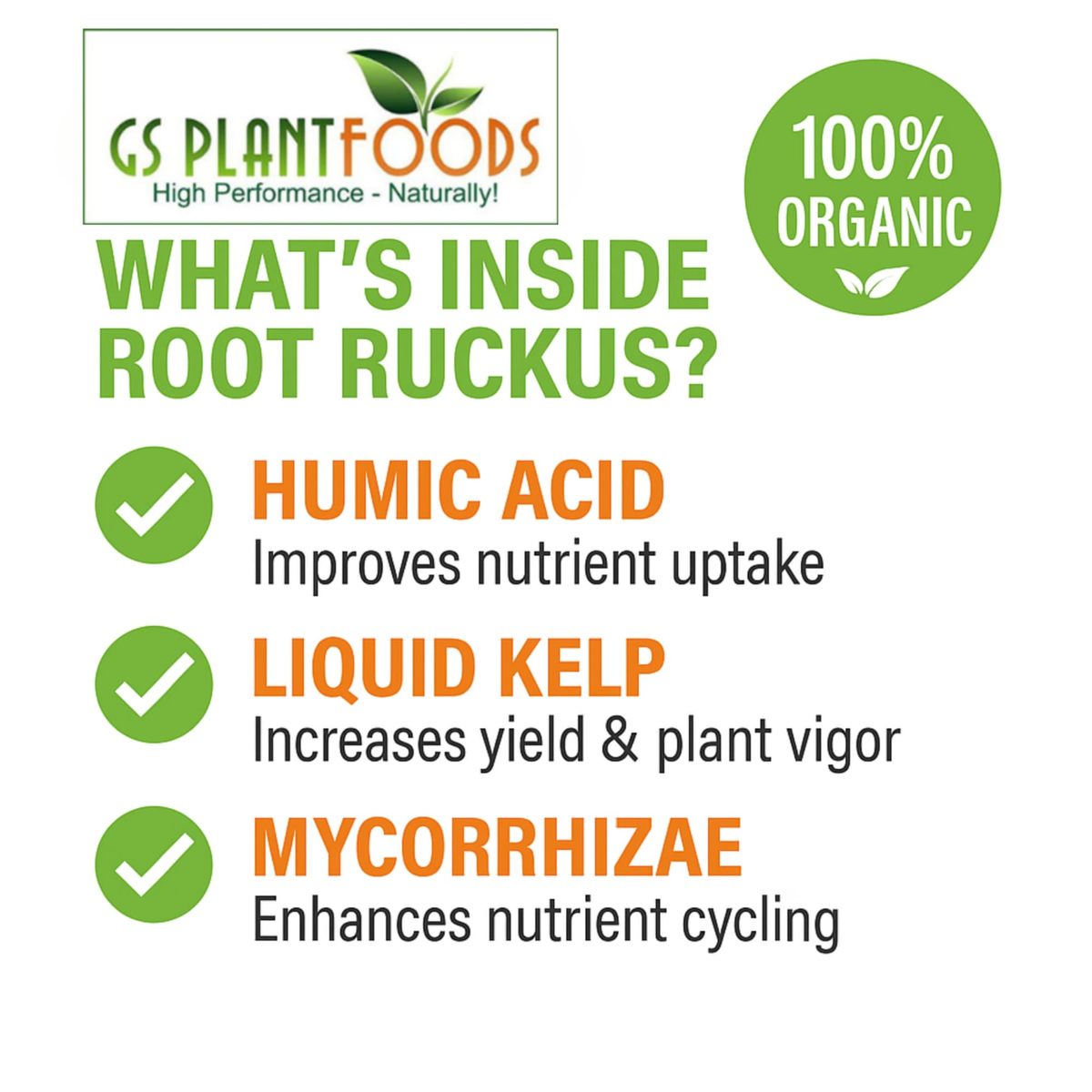 Product description: GS Plant Foods? Root Ruckus is a fertilizer that promotes soil health enables plants to more effectively process nutrients. It improves nutrient uptake increases water retention. Root Ruckus! also helps condition the soil for improved plant performance.