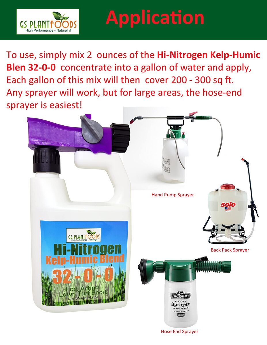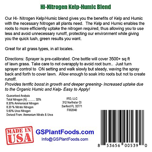 Product description: GS Plant with Hi-Nitrogen Kelp-Humic Blend 32-0-0 is the perfect solution for your lawn care needs. Its powerful formula contains organic Kelp and Humic for greater nutrient uptake and health, suitable for all grass types. The 32-0-0 nutrient balance promotes quick greening and growth, making it ideal for nitrogen-deficient turf suffering from yellowing leaves, light green color, thin density, and slow growth. Made with top-quality ingredients, GS Plant provides superior nutrition for the best growth and health of your lawn. One quart covers 3,000+ square feet, making it easy to apply and effective for your lawn care needs. GS Plant is also environmentally friendly, containing organic ingredients and promoting efficient nutrient uptake, reducing unnecessary runoff, and protecting the environment. Keep your lawn healthy and beautiful with GS Plant.