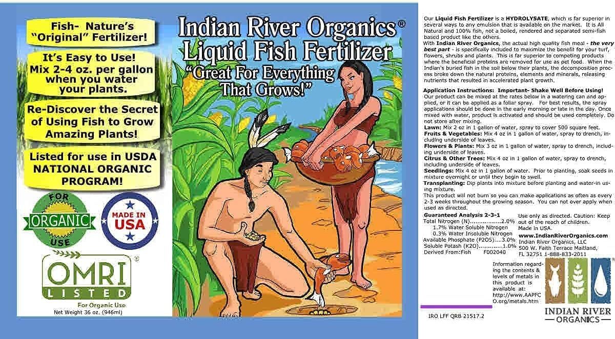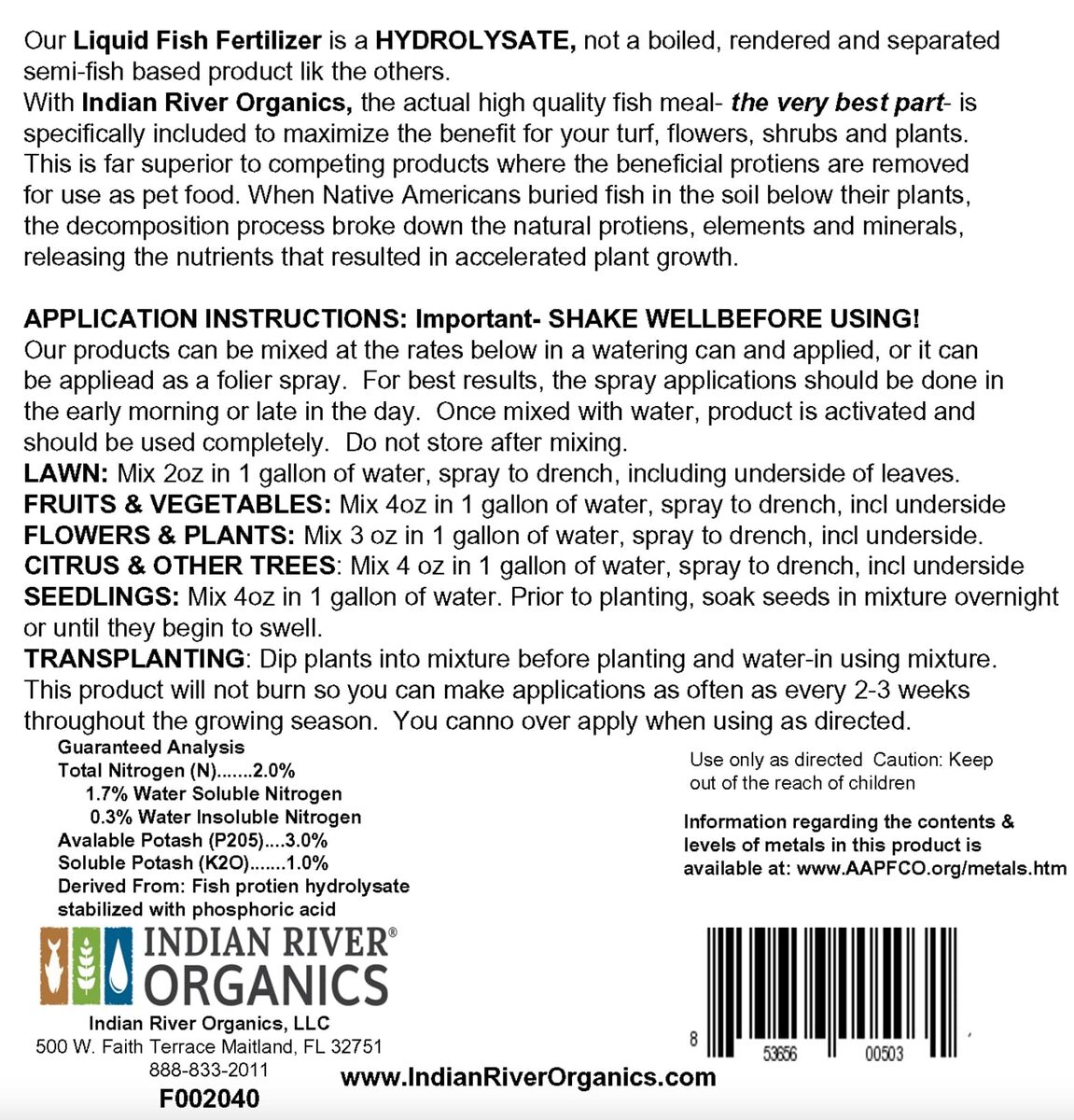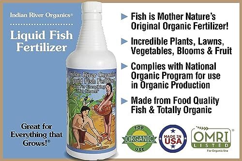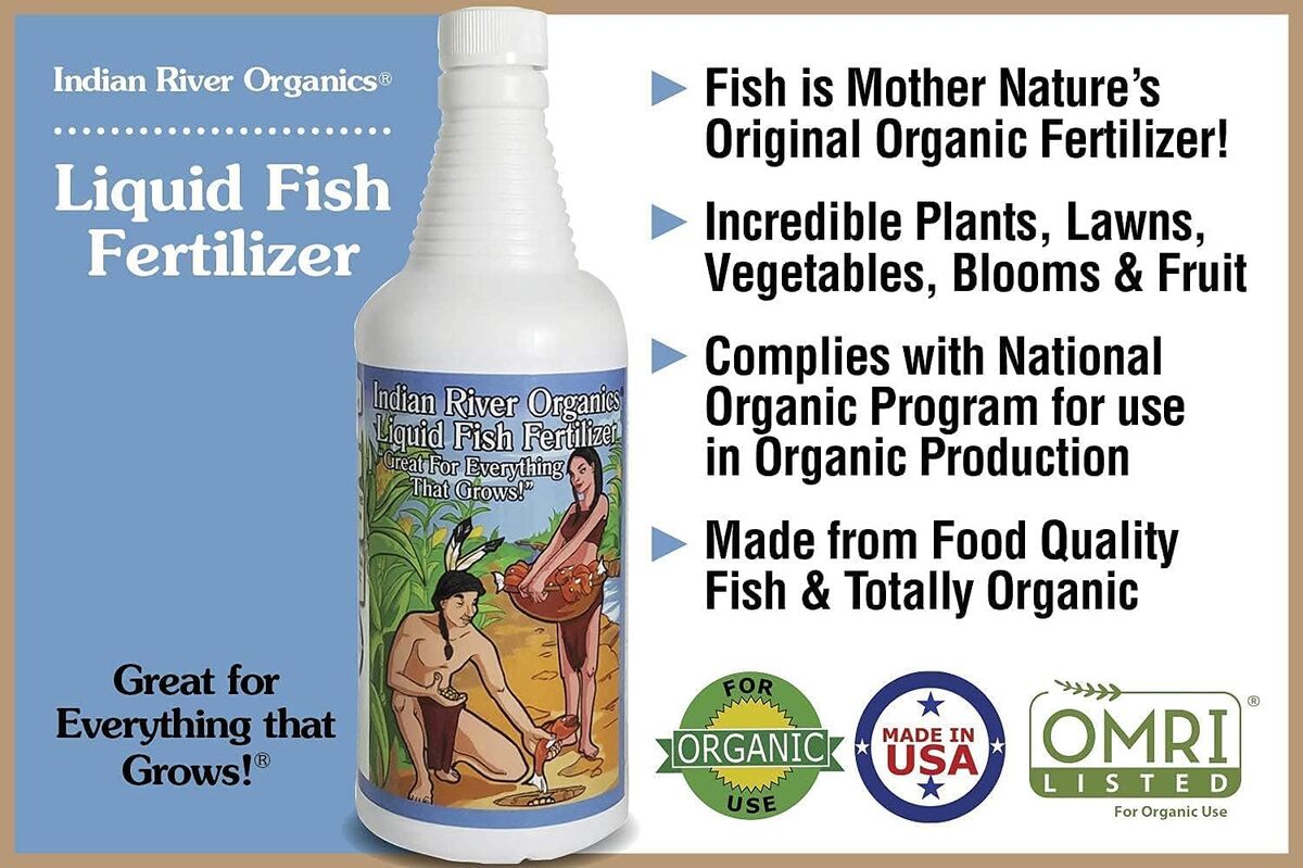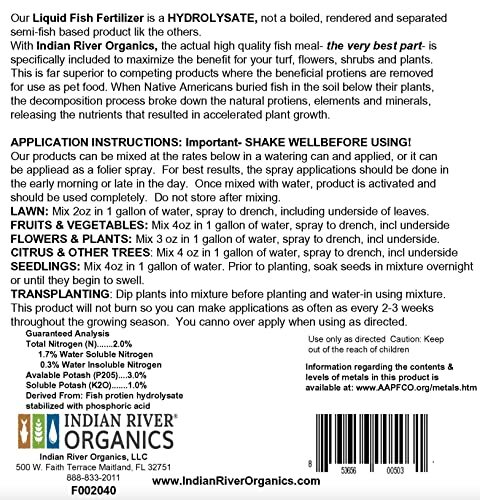 Bullet point: OMRI ?ORGANIC LISTED HYDROLYZED FISH FERTILIZER: Indian River Organics Liquid Fish Fertilizer is an all-natural high quality fish fertilizer that gives excellent plant growth. Plants receiving our organic fish fertilizer out-perform in every category, they are much healthier and more resistant to heat, drought, and cold. This means they bloom more, produce bigger fruit, and taste better. With our organic liquid fish fertilizer, grass spreads faster and needs less maintenance.