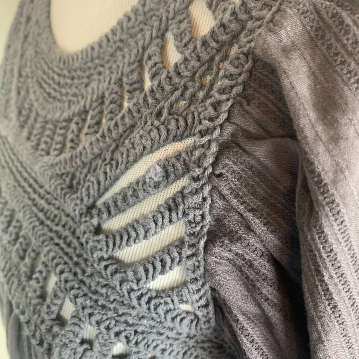 There is a very small snag in the crochet area at the top. See photos for detail.