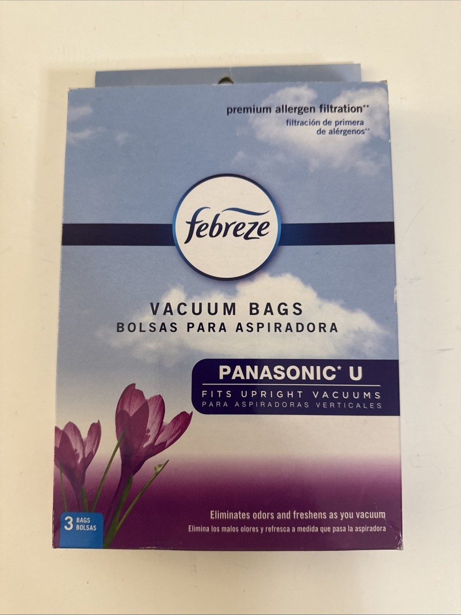 The Febreze Vacuum Bags Panasonic U 3 Pack Premium Allergen Filtration Spring is a set of vacuum cleaner bags designed specifically for Panasonic upright vacuums. These bags are made of paper and come in a pack of three, providing a disposable solution for efficient cleaning. With features like allergen filtration and Energy Star compliance, these bags offer reliable performance while helping to reduce allergens in your home. The Febreze brand ensures quality and compatibility with Panasonic U vacuum cleaners, making it an ideal choice for maintaining a clean and healthy living space.