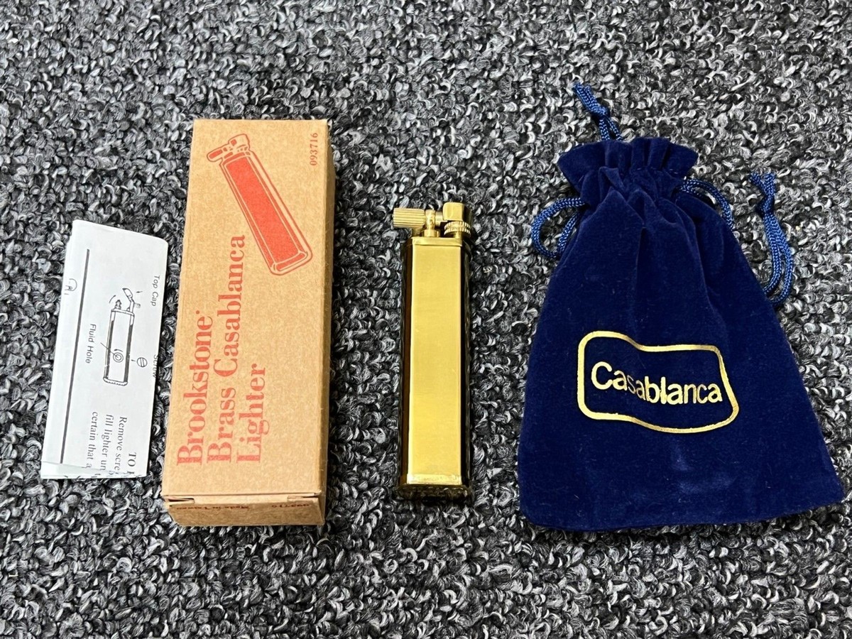 The item for sale is a brand new in box vintage Brookstone Casablanca Brass Cigarette Lighter.