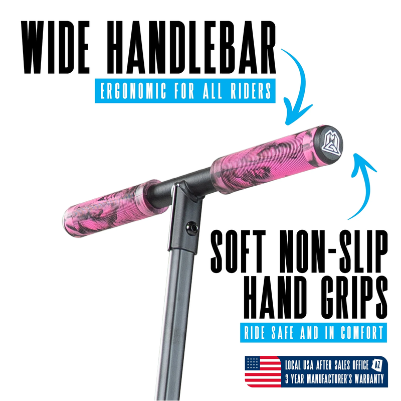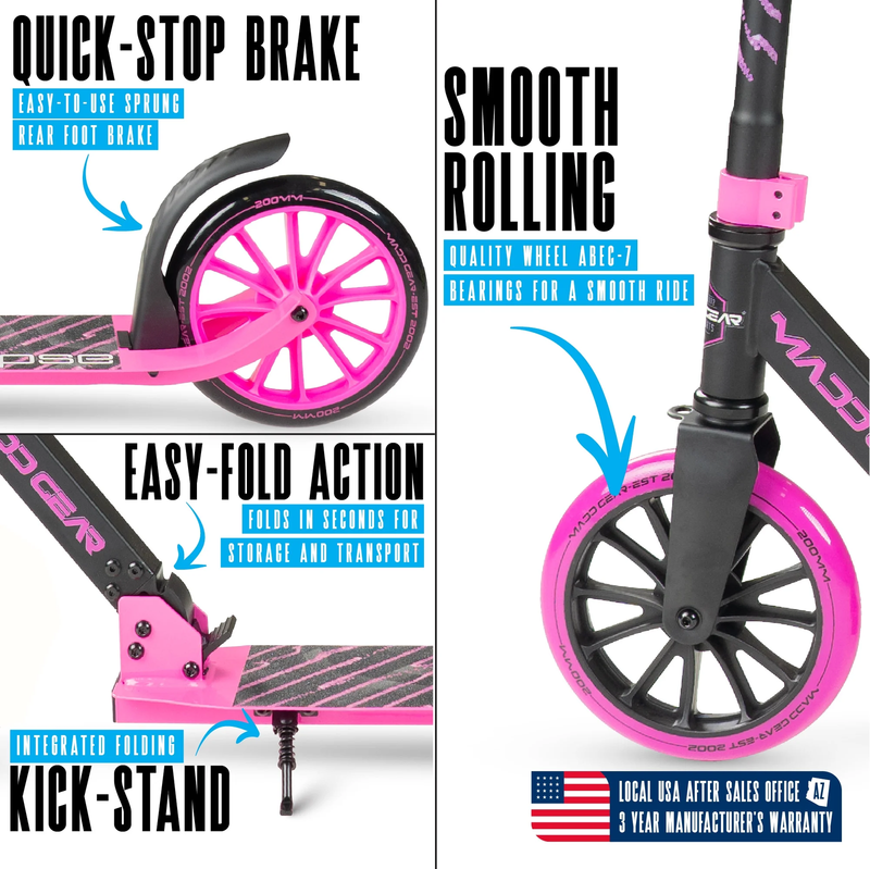 ECLIPSE 200 PINK Madd Gear Eclipse 200 Big Wheel Folding Scooter - Ideal for big kids, teens or adults with an ultra-smooth ride on 8" wheels combined with tall height-adjustable handlebar! Ergonomic Low-Profile Deck Not Seen on Others - Swoops lower to the ground so pushing is more comfortable with less bending!