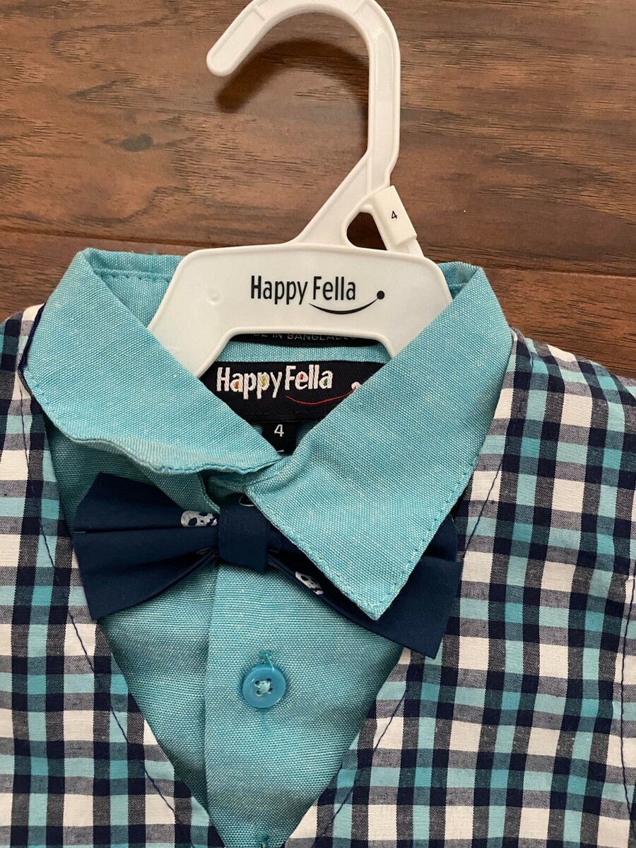 new HAPPY FELLA sz 4T Blue Button Up Shirt With Plaid Vest and Bowtie 3 pc. Set