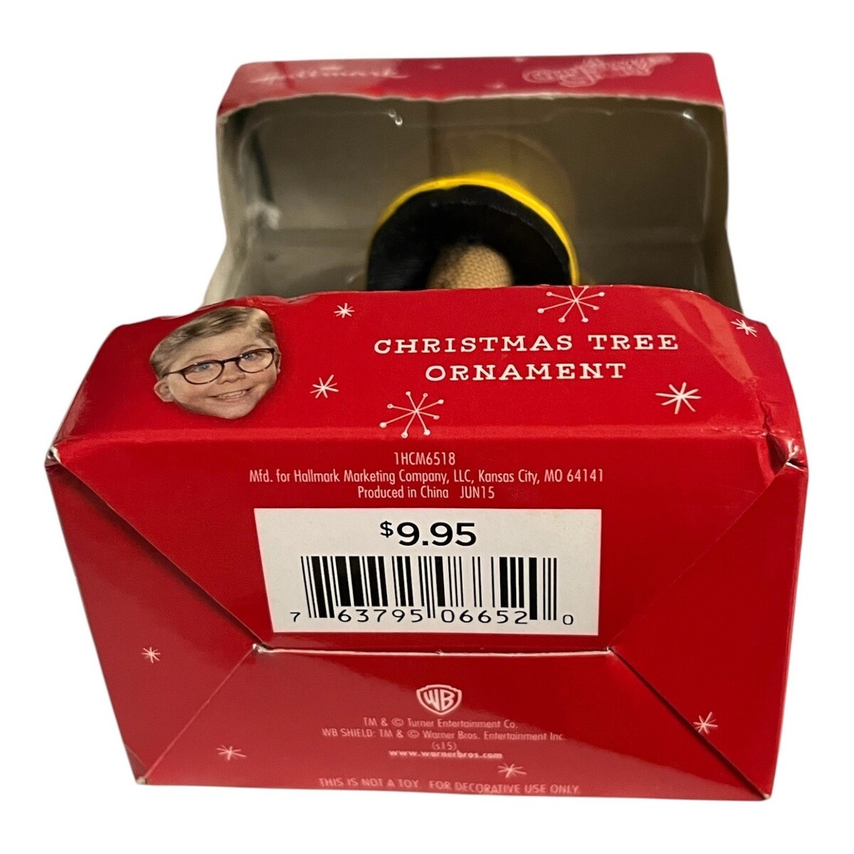 Fun Hallmark ornament featuring the iconic Leg Lamp from *A Christmas Story*. Comes in the original 2015 box with clear window. Box shows noticeable wear, creasing, and edge dents, but ornament inside is unused and still secured.