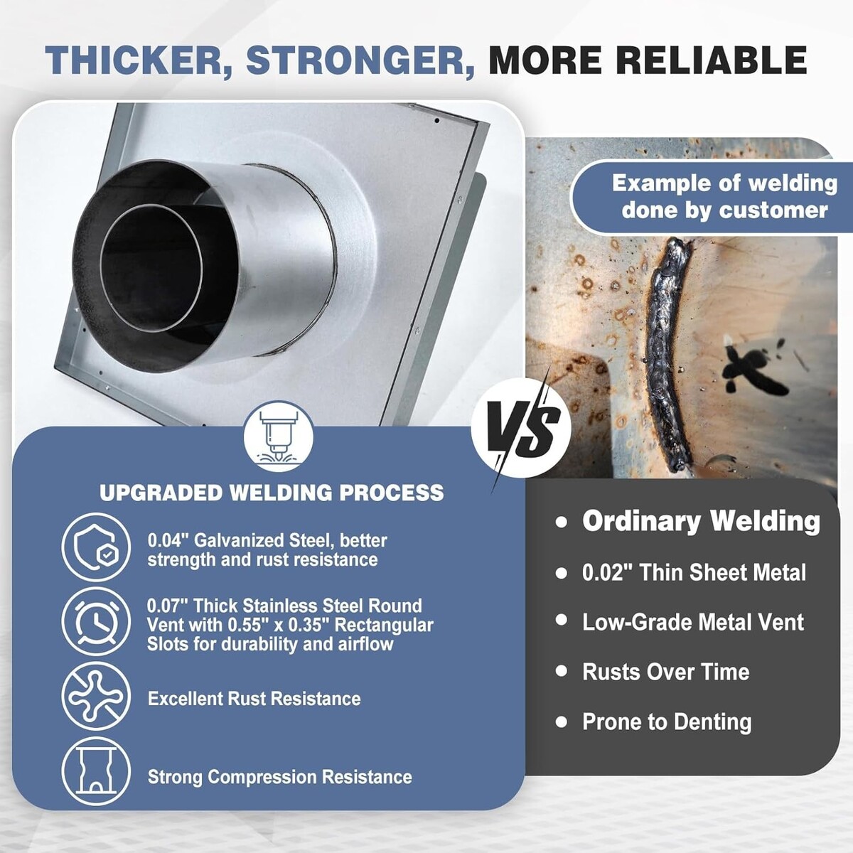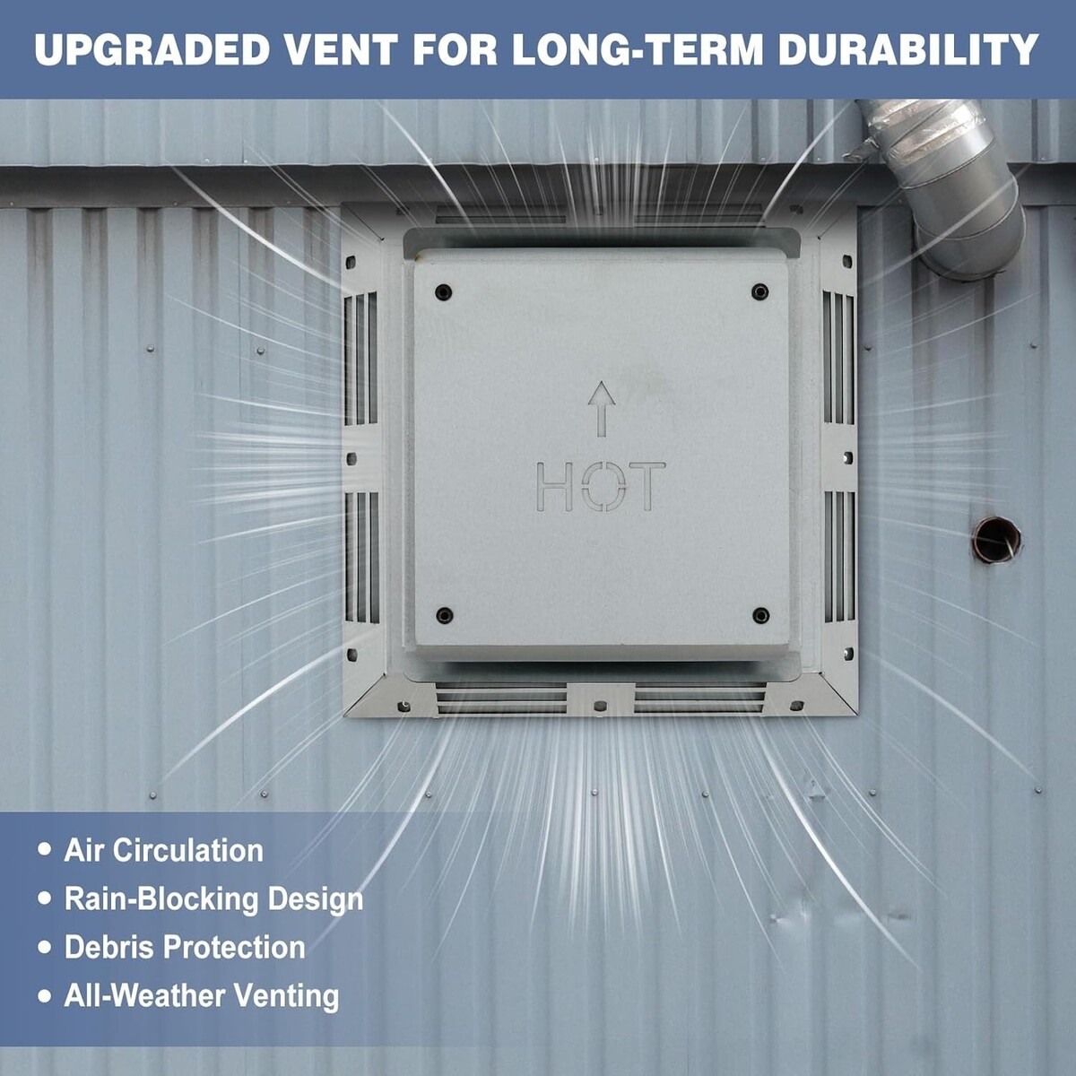 Upgraded for Long-Term Durability: reinforced with thicker galvanized steel and double-welded edges on all sides. Stress-prone areas are specially enhanced to prevent bending, rusting, or punctures. The round vent is upgraded to a 0.07-inch thick structure for enhanced mechanical resistance while maintaining efficient airflow?ideal for both harsh weather and heavy-duty commercial use