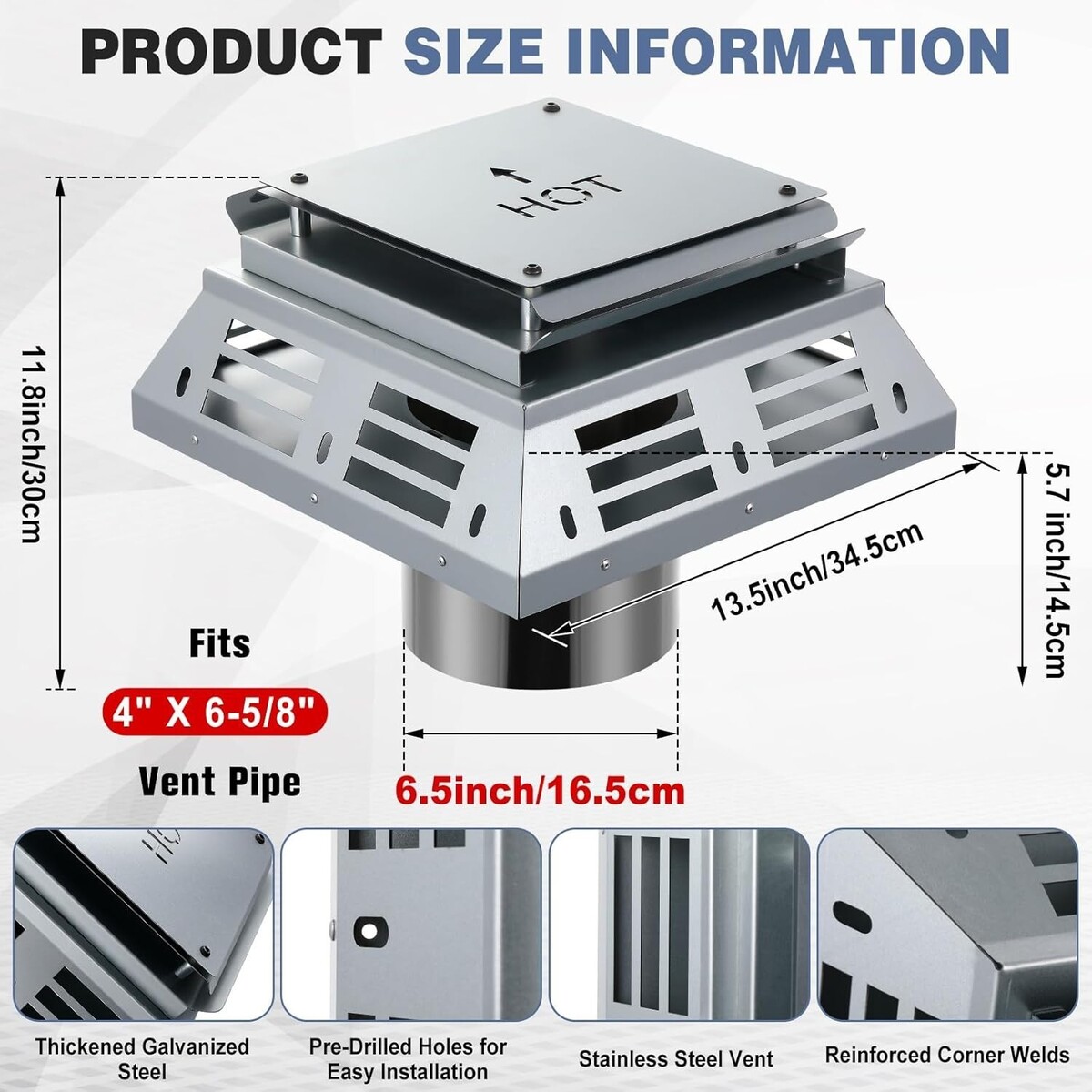 Universal Fit: this square vent cap measures 13.5 x 13.5 inches with an overall height of 12.6 inches. The circular vent opening is 6.5 inches in diameter and 5.7 inches high. Weighing 12.8 lbs, it's suitable for most standard rooftop and wall duct terminations