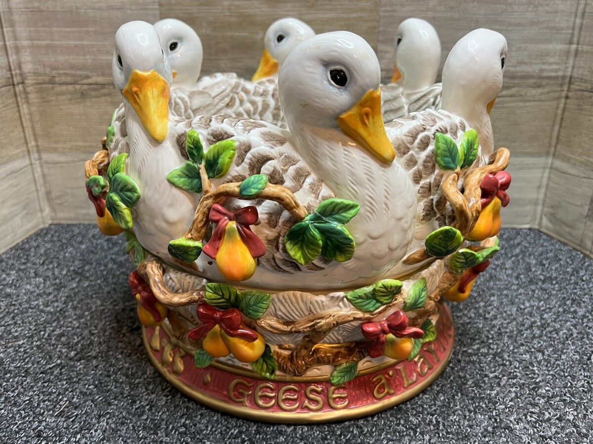 The item for sale is a vintage 2000 Fitz Floyd Twelve 12 Day of Christmas '6 Geese a Laying' Centerpiece Bowl. In good used condition, but does have a leaf broken off of one of the geese. See video and close-up photos.