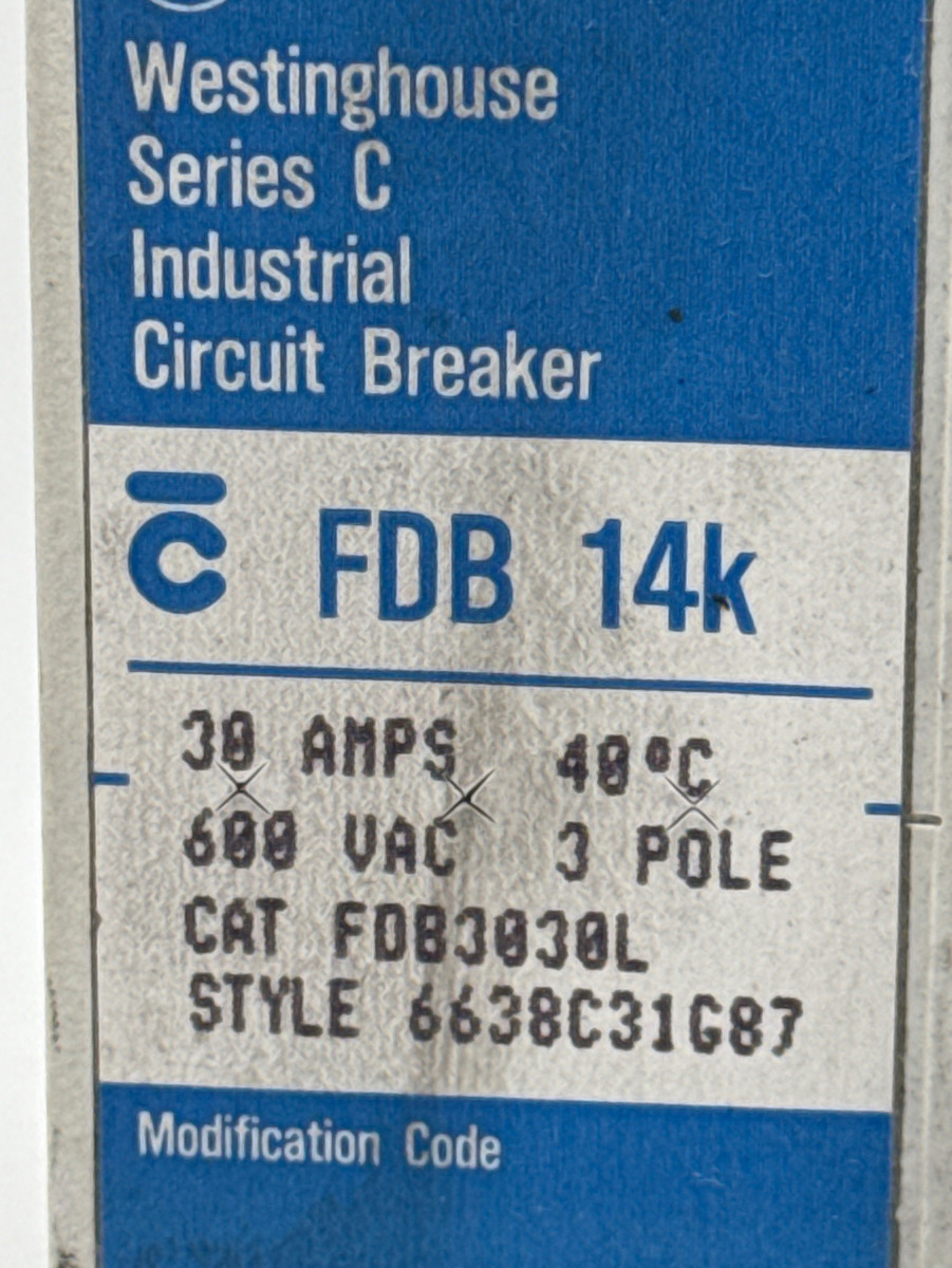 Westinghouse FDB3030L 3-Pole Circuit Breaker, 600VAC 30Amp