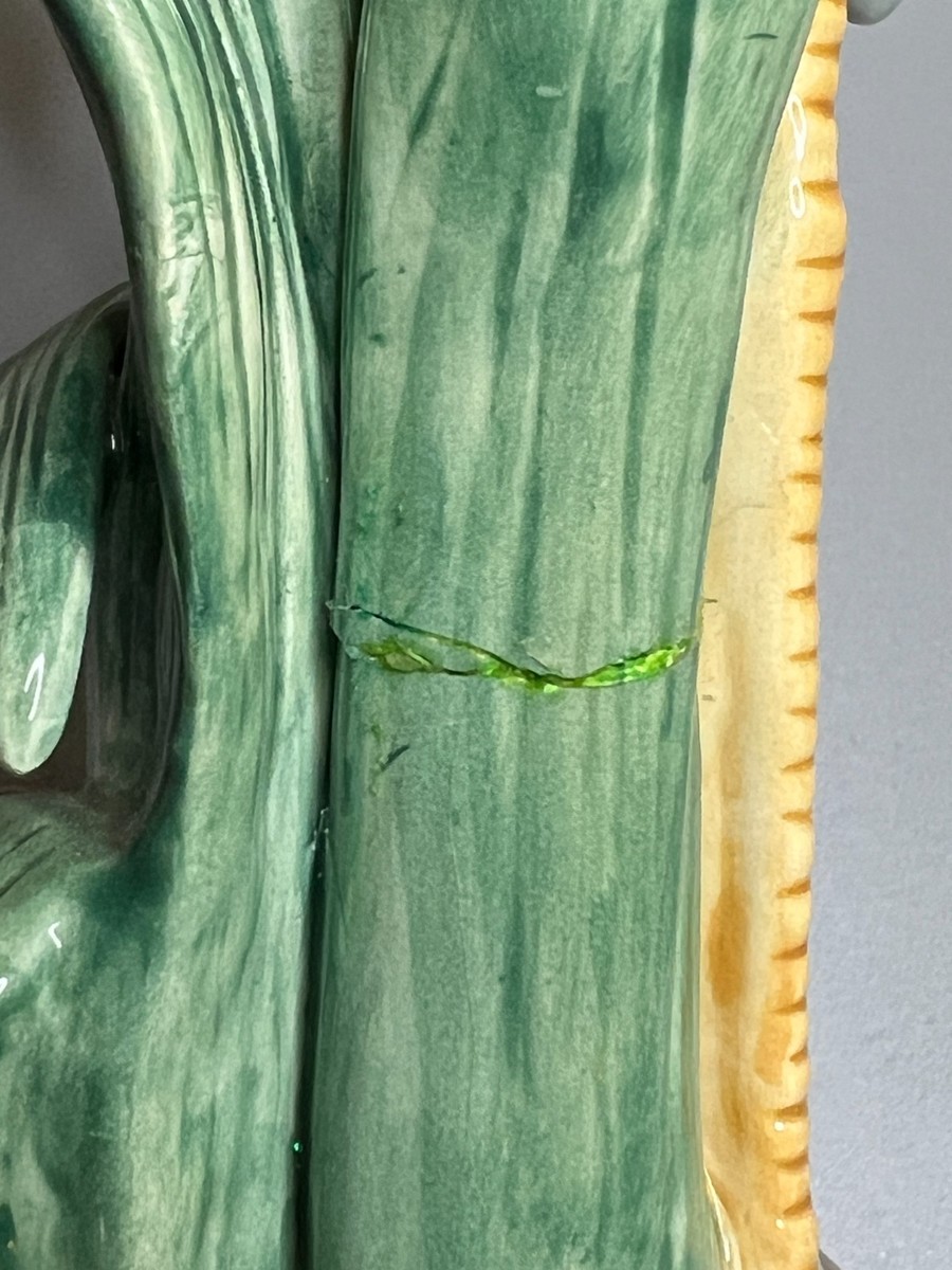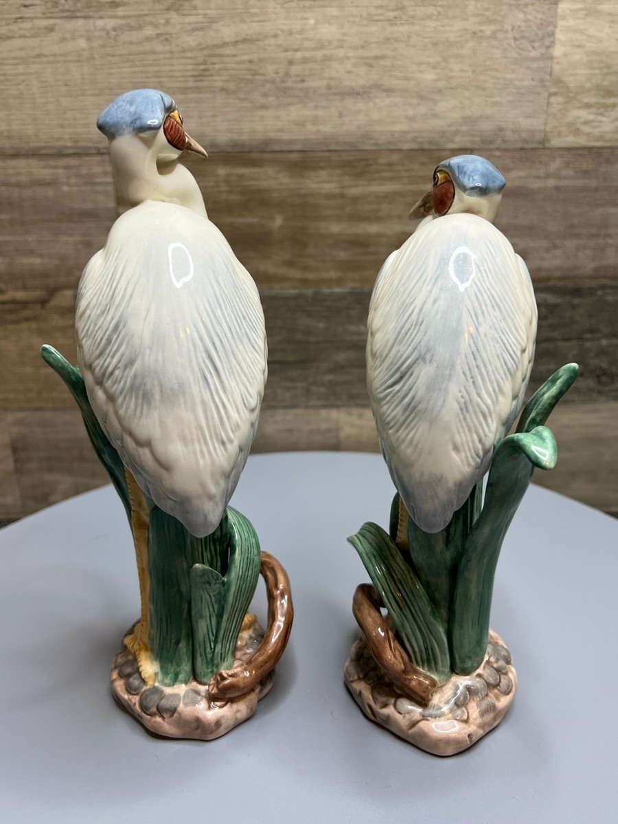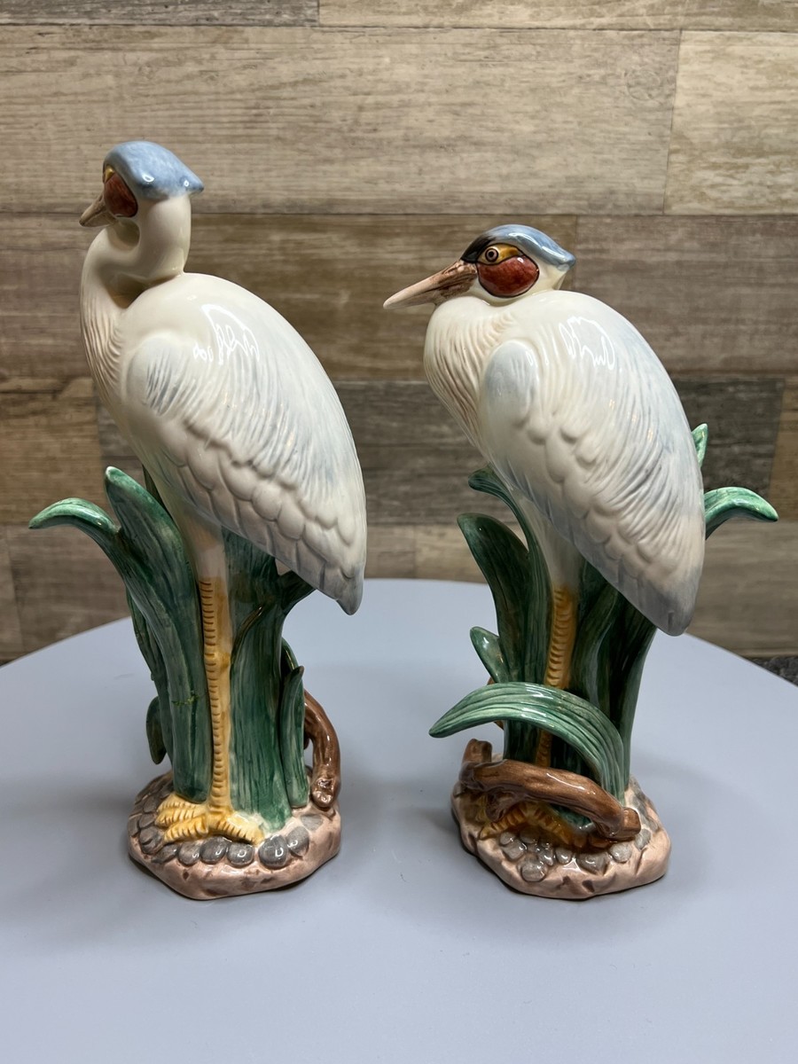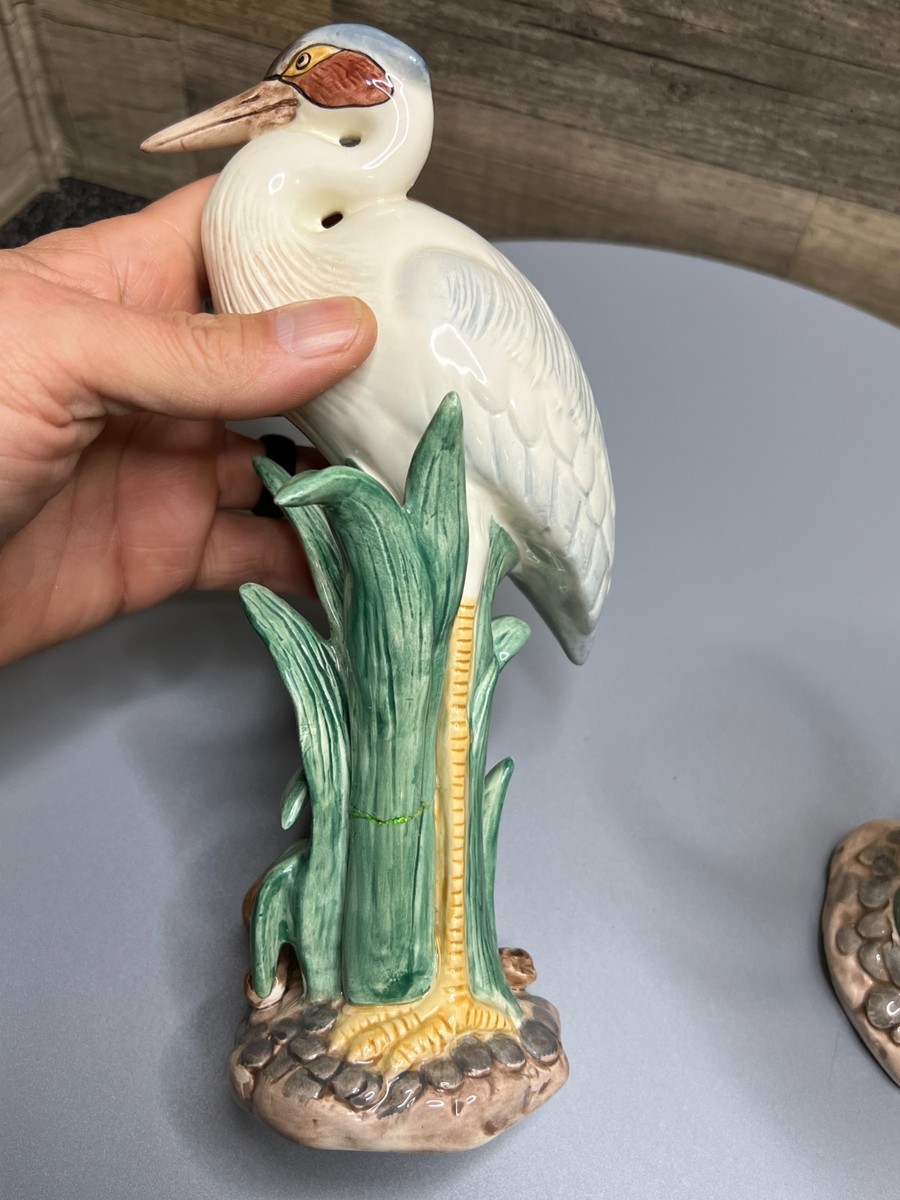 The item for sale is a vintage pair of Fitz and Floyd Marsh Egrets Birds. the taller one has a repair where one of the blades of grass was broken. In good condition otherwise. The shorter of the two is in good used condition with no chips or cracks. We found these in a storage unit we bought recently.