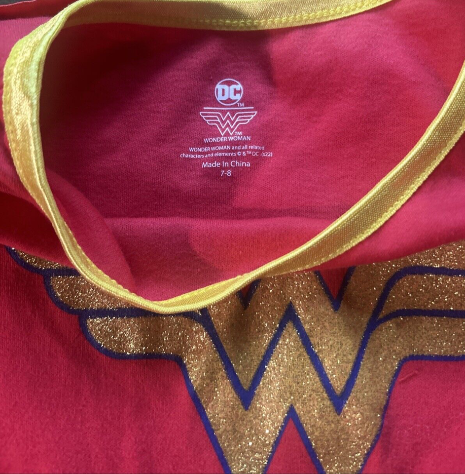 This is a DC Comics Wonder Woman costume for girls, size youth 7-8. The dress features a multicolor design with a scoop neckline, short cap sleeves, and knee-length hem. It includes a matching cape for a superhero look. The dress is made of polyester material and is designed for both party and casual occasions. Perfect for young fans of the Wonder Woman character from the DC Comics universe.