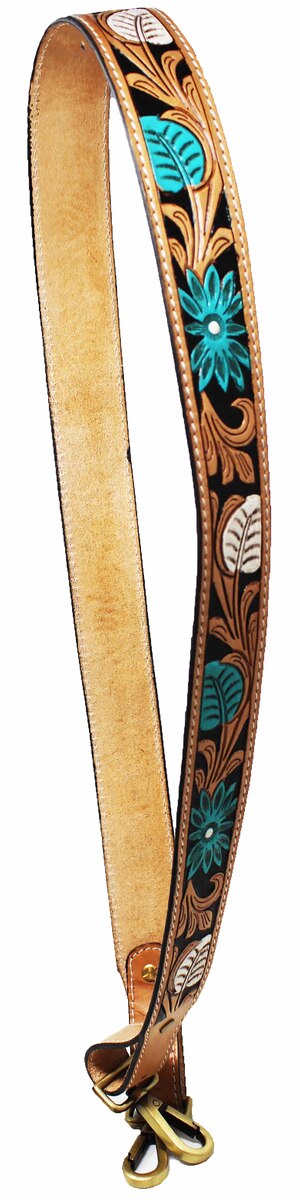 Challenger 1-1/2" wide genuine heavy-duty full grain cow leather replacement shoulder strap. Strap is beautifully accented with hand tooled floral design, and turquoise painted flowers. This versatile shoulder strap adds a western fashion look to any crossbody bag. Comes complete with antique brass hardware. Strap adjust from 43" to 47" long with chicago screws, and is 1-1/2" wide.